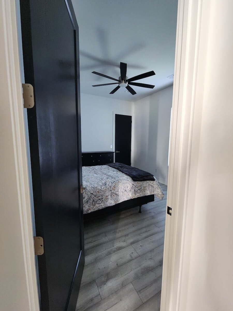 Interior Painting Services: Our Coosaw Creek painting team delivered exceptional results featuring dramatic accent walls painted in deep charcoal creating sophisticated focal points in bedrooms, modern hallways with crisp white walls contrasting against bold black doors and trim, and a unique staircase with alternating black and white steps creating striking visual impact. The home includes an expansive covered patio with natural wood plank ceiling requiring precision staining and protective finishing, multiple rooms with coordinated neutral gray and white color palettes, and seamless paint application throughout all interior spaces. Black window and door frames provide contemporary contrast throughout the home.
