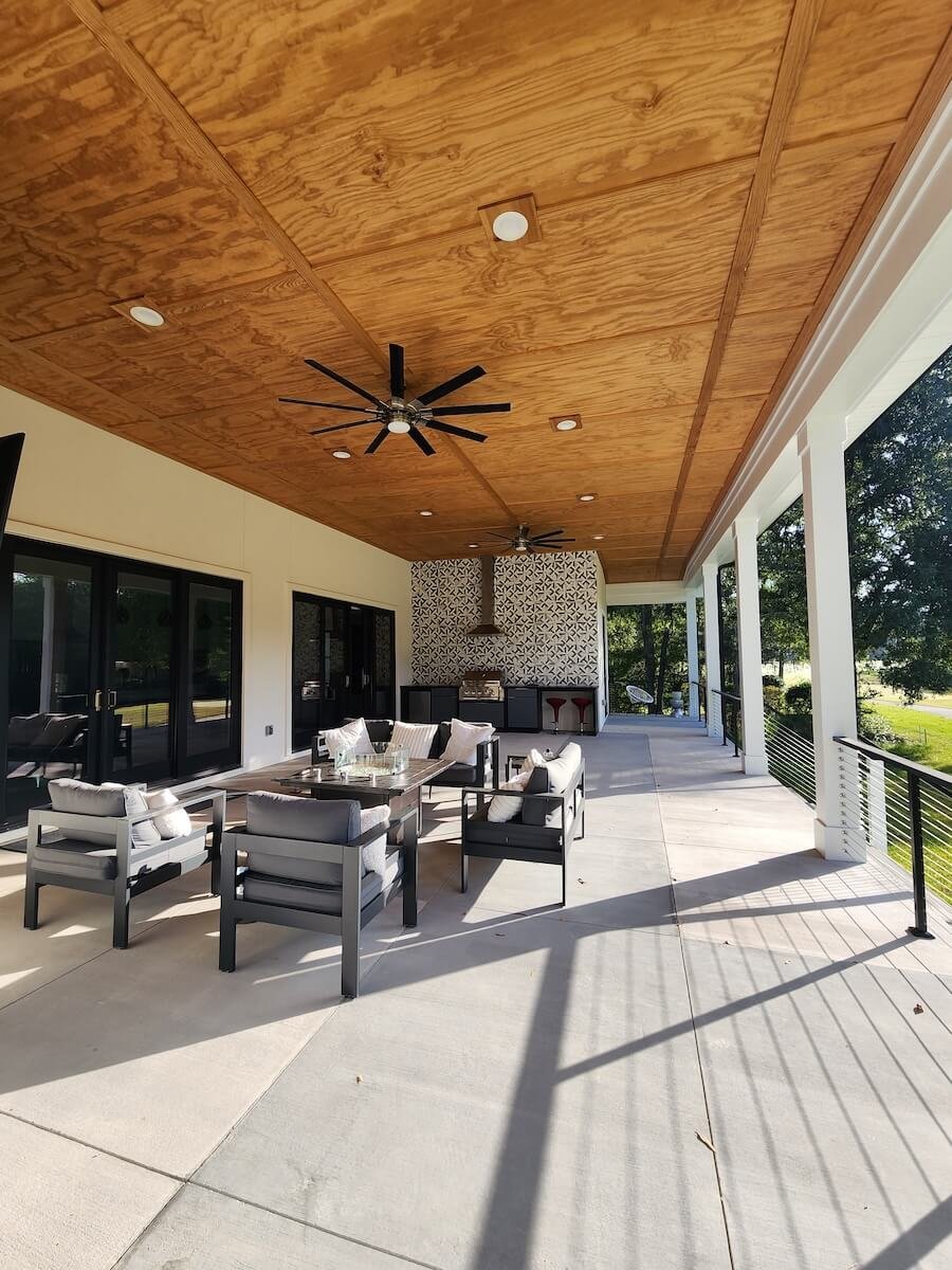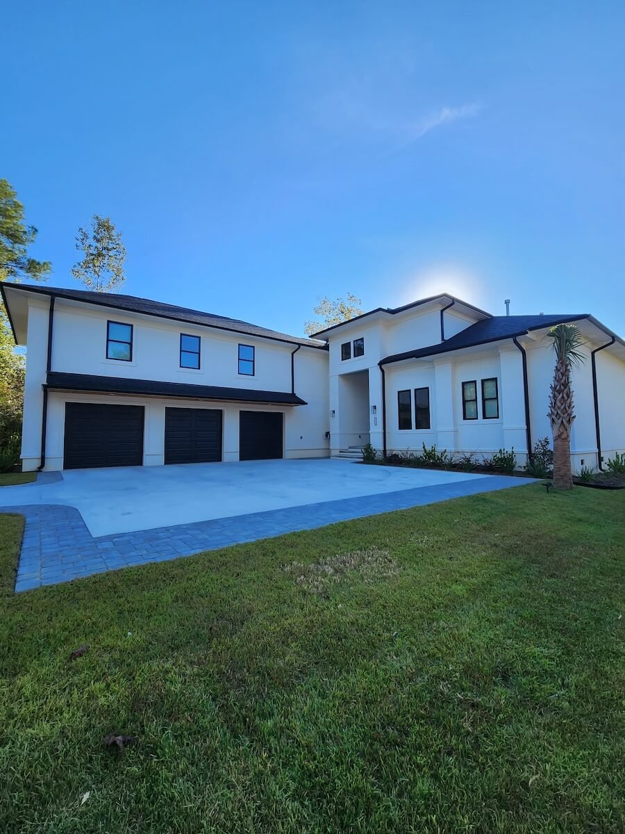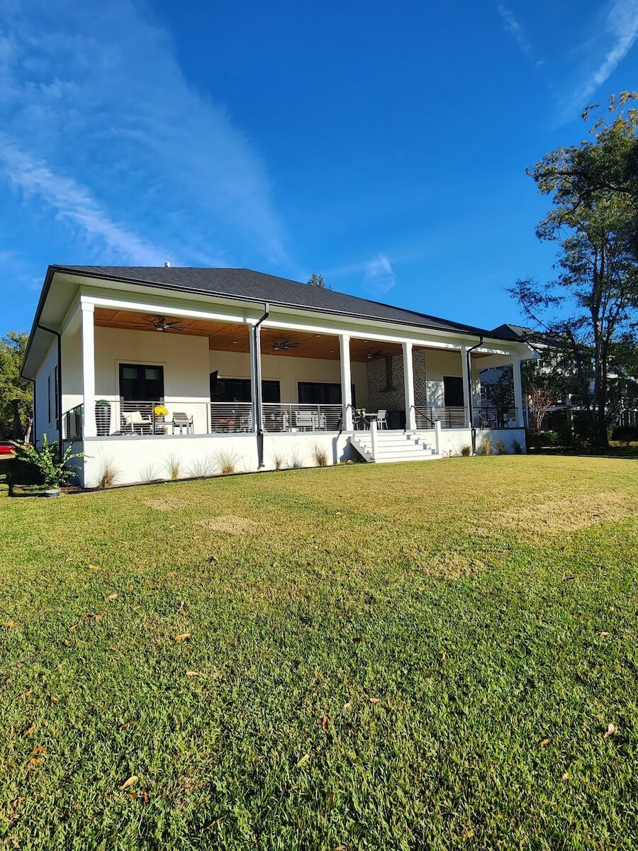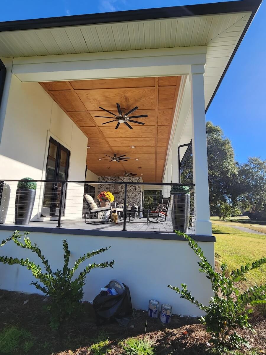 Exterior Painting: The modern exterior features a clean white color scheme with premium weather-resistant finishes, contemporary architectural lines with minimal trim creating sleek design, and a three-bay garage with professional paint application. The extensive covered outdoor living area includes natural wood ceiling staining that complements the modern white exterior, all completed with weather-resistant products designed for Charleston’s climate.