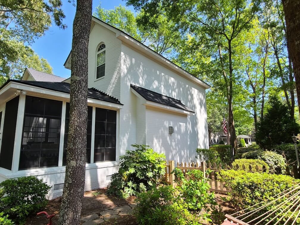 Exterior Painting Services: Our North Charleston painting team delivered an impressive transformation featuring complete brick painting from traditional red brick to fresh pale green tones creating modern curb appeal, extensive trim work painted in crisp white including windows, doors, columns, and architectural details, and multi-level exterior requiring professional scaffolding and surface preparation for proper brick coating adhesion. The project includes a detached garage painted to match the main house creating cohesive design, screened porch with detailed trim and column painting, and premium masonry paint products specifically designed for brick surfaces ensuring long-lasting durability and protection against Charleston’s climate.