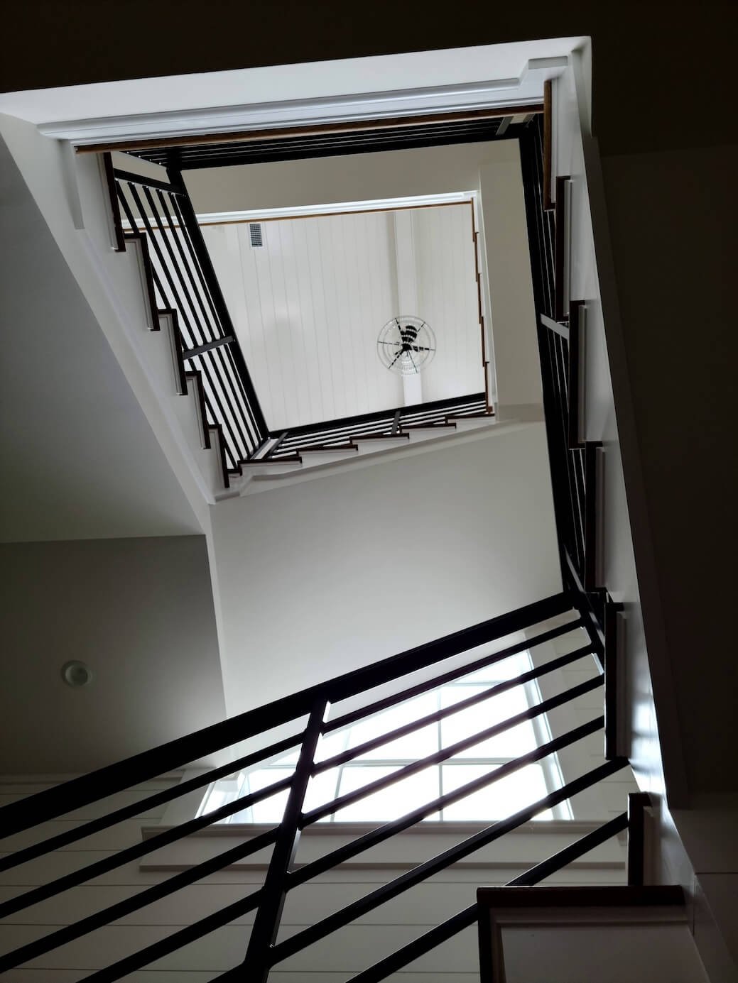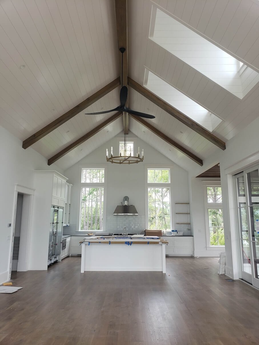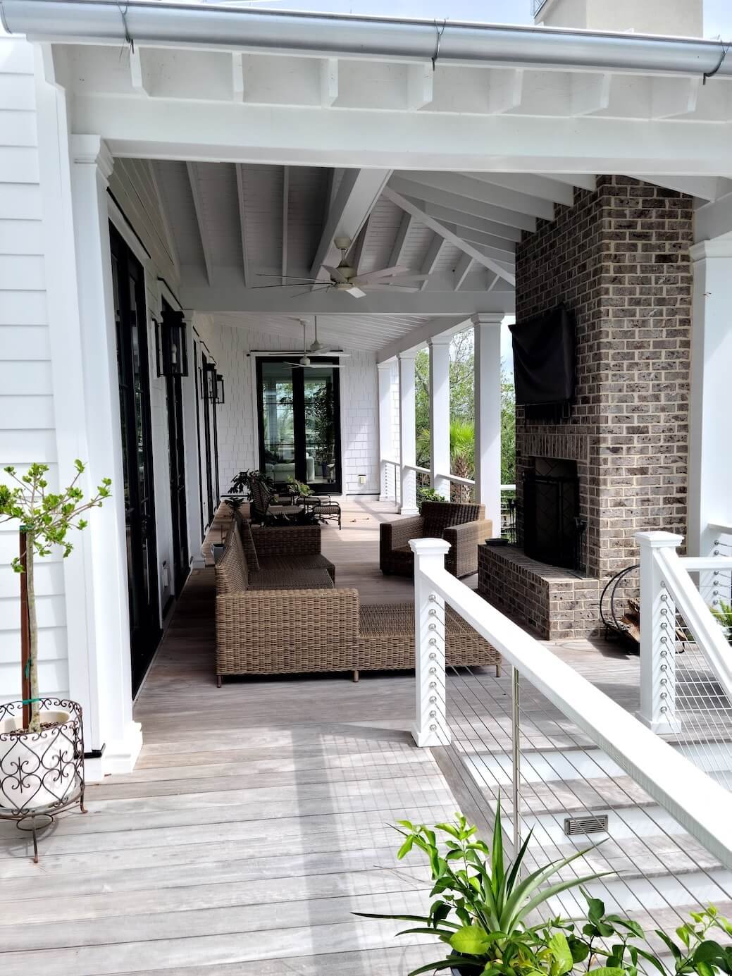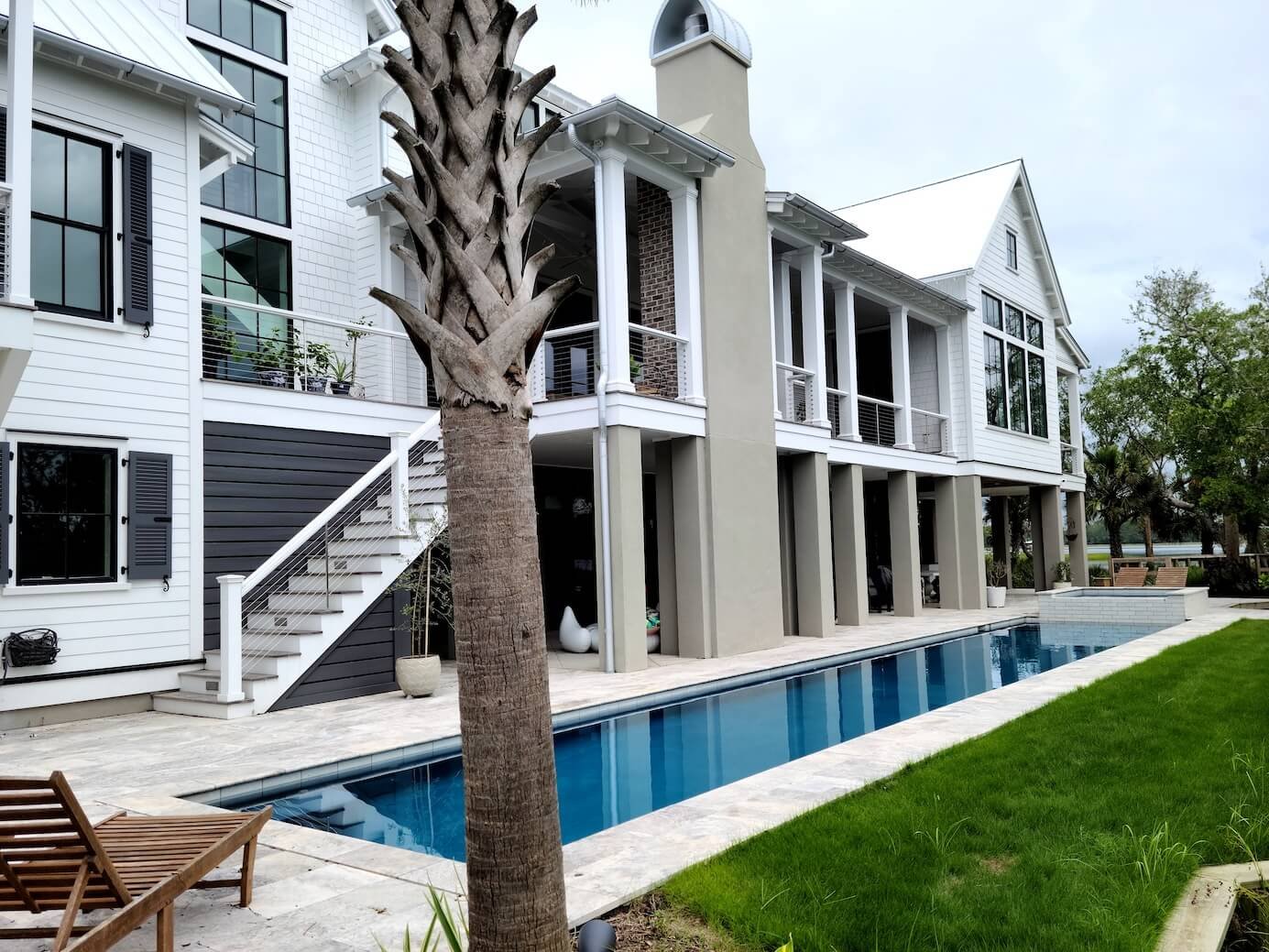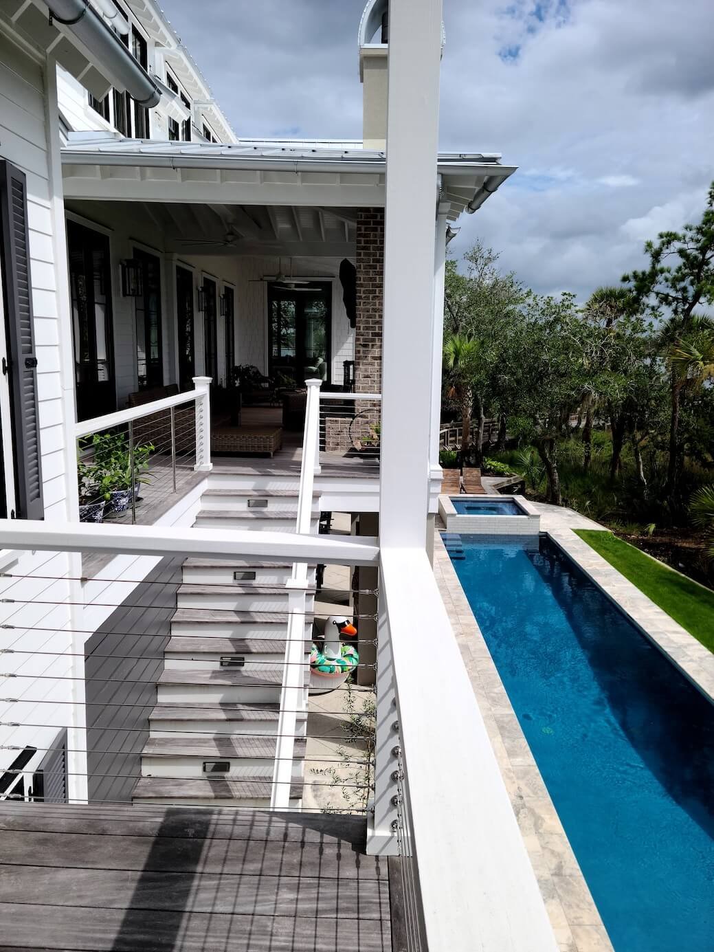 Exterior Painting: The striking contemporary exterior features clean white architectural lines with premium weather-resistant finishes, multi-level design with extensive trim work, railings, and detailed elements, and professional painting completed on all balconies, porches, and pool deck areas. Our painting contractors applied specialized coatings designed for Charleston’s coastal climate and luxury home standards.