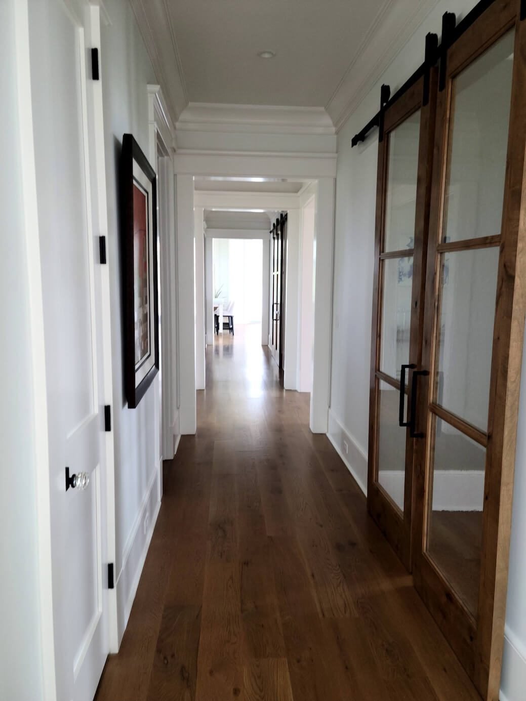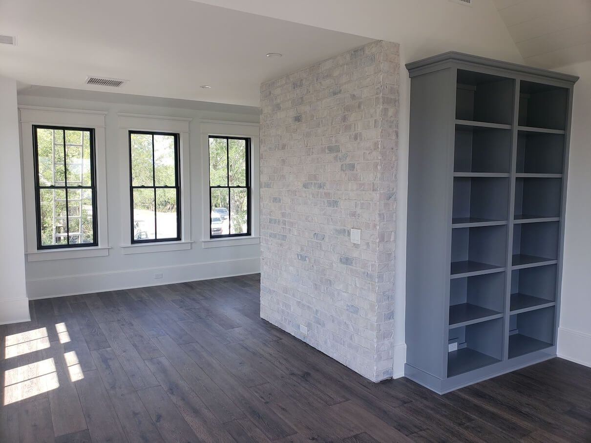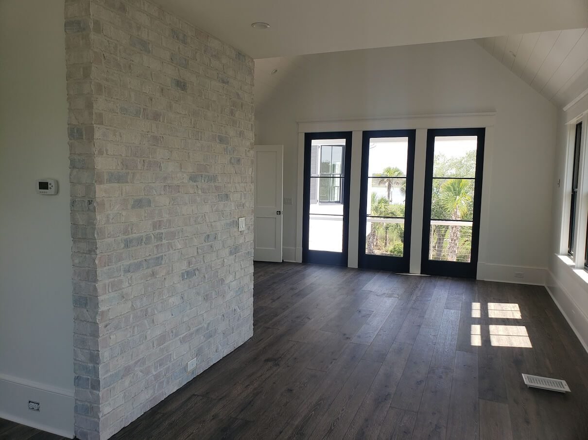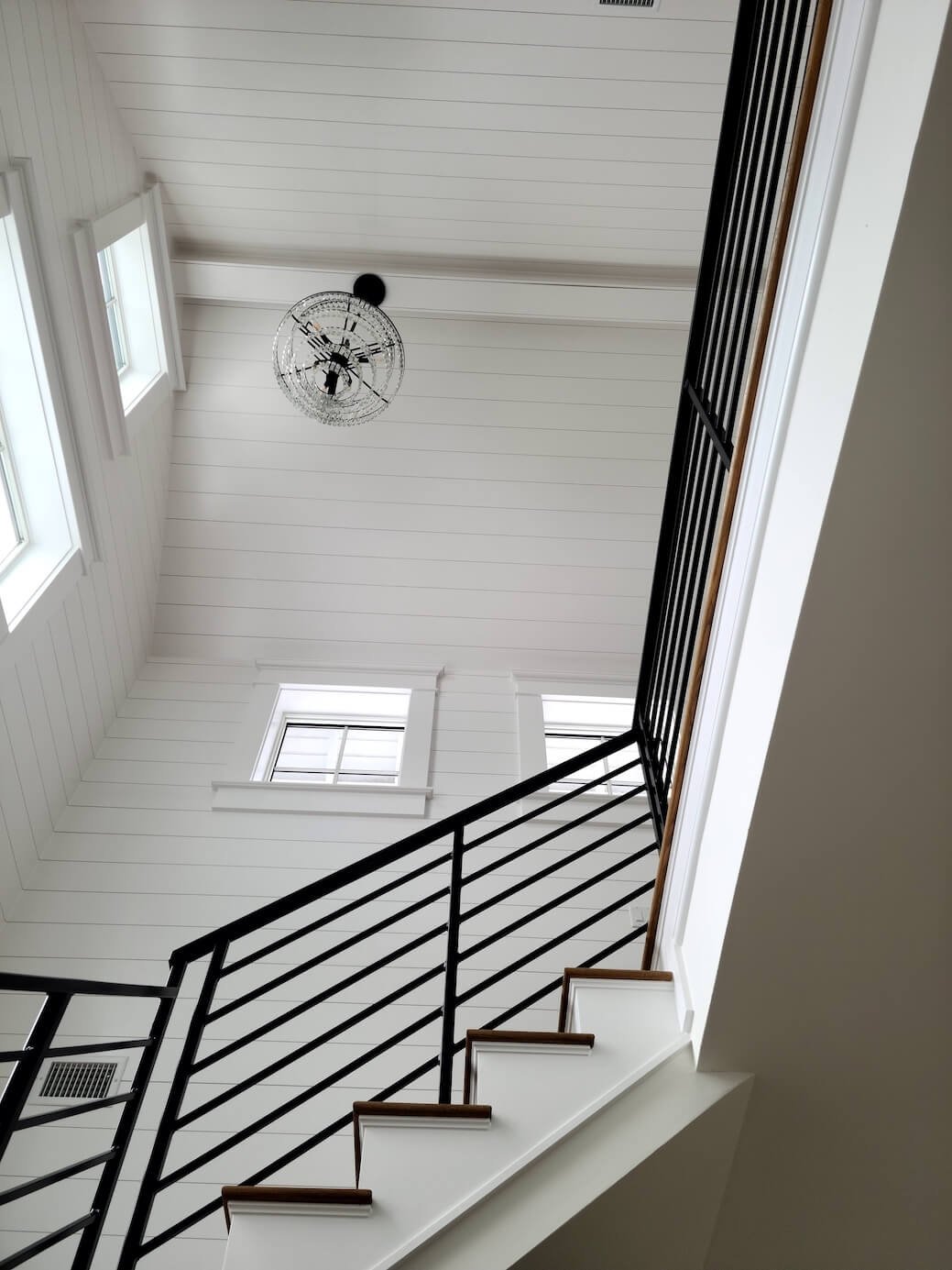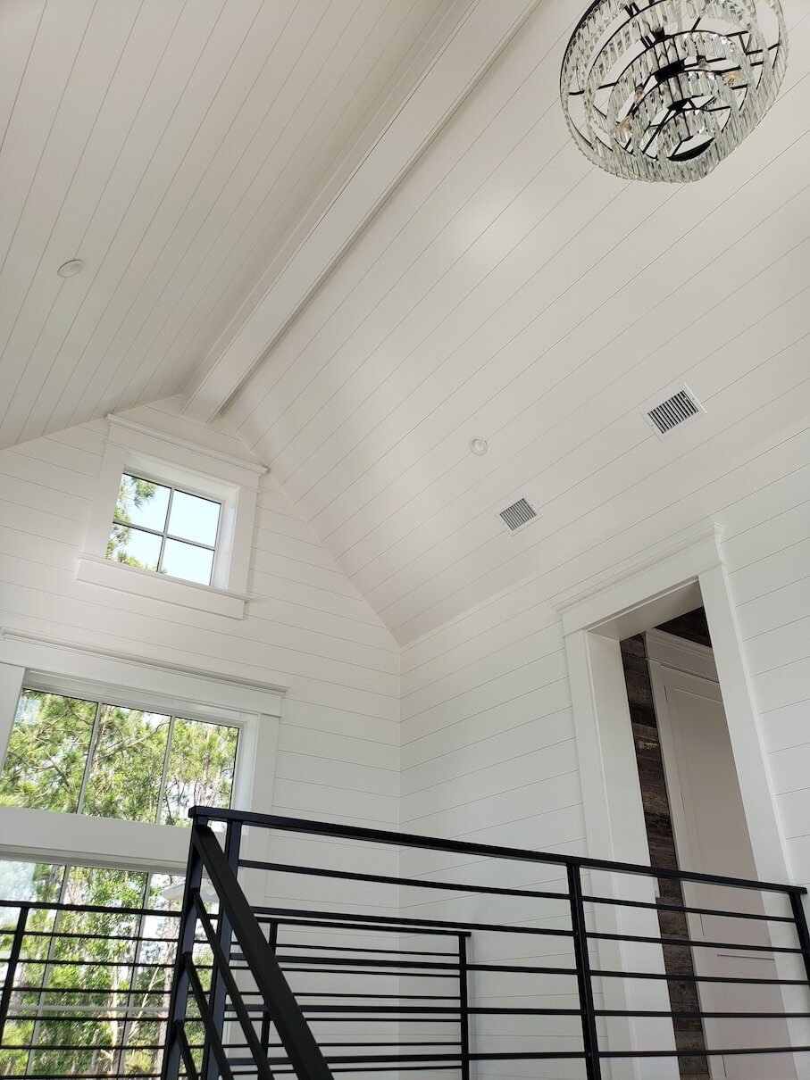 Interior Painting Services: Our Mount Pleasant painting team delivered outstanding results featuring stunning wood plank ceilings with natural stain finishes throughout main living areas creating warmth and elegance, dramatic white brick accent walls providing modern texture and visual interest, and cathedral ceilings with exposed beams requiring precision staining and paint coordination. The home includes multiple staircases with sleek black metal railings contrasting against pristine white walls, elegant hallways with modern black barn doors and smooth wall finishes, and coordinated neutral color palettes maximizing the abundant natural light. Floor-to-ceiling windows throughout required meticulous trim work and paint detailing.