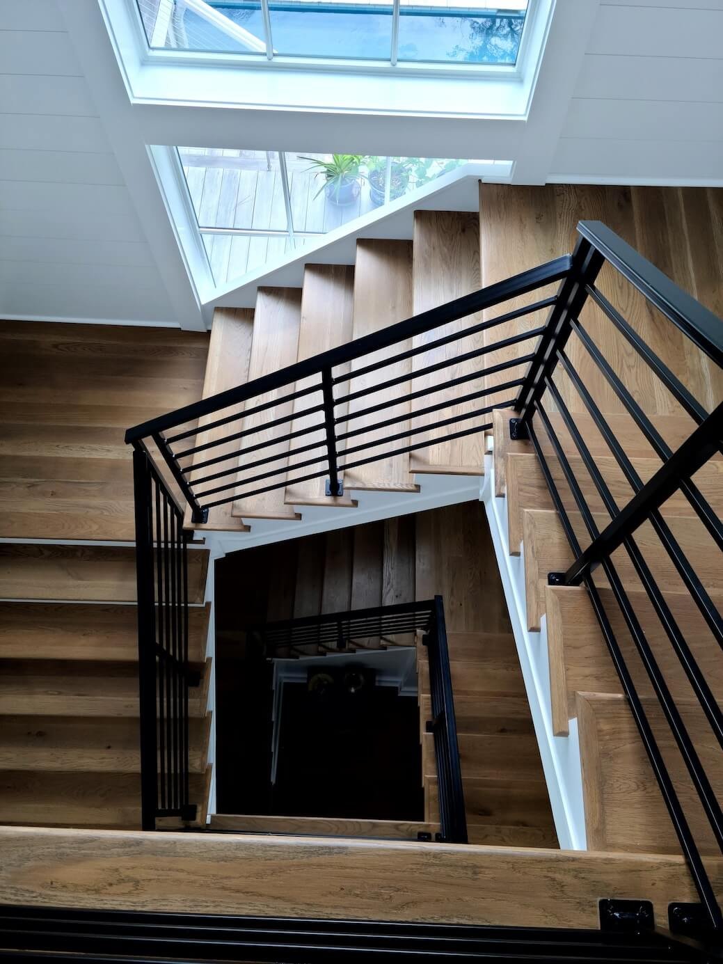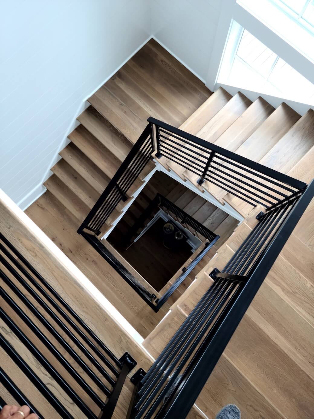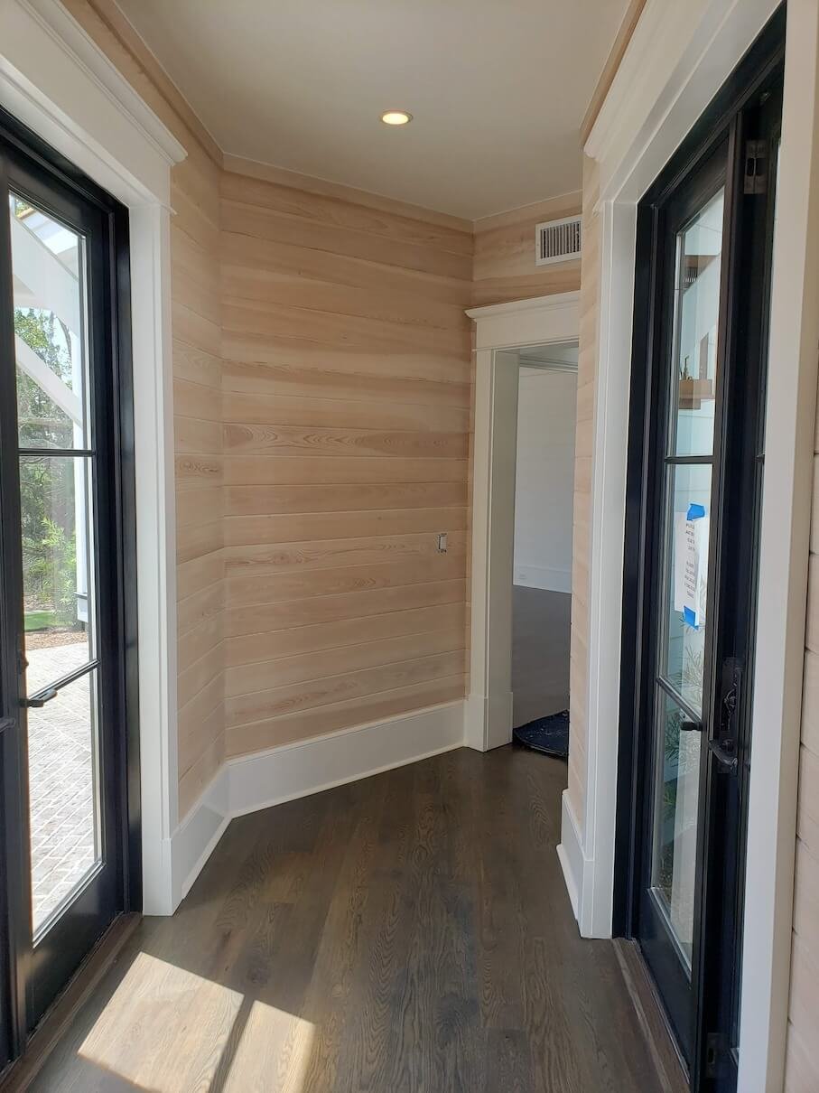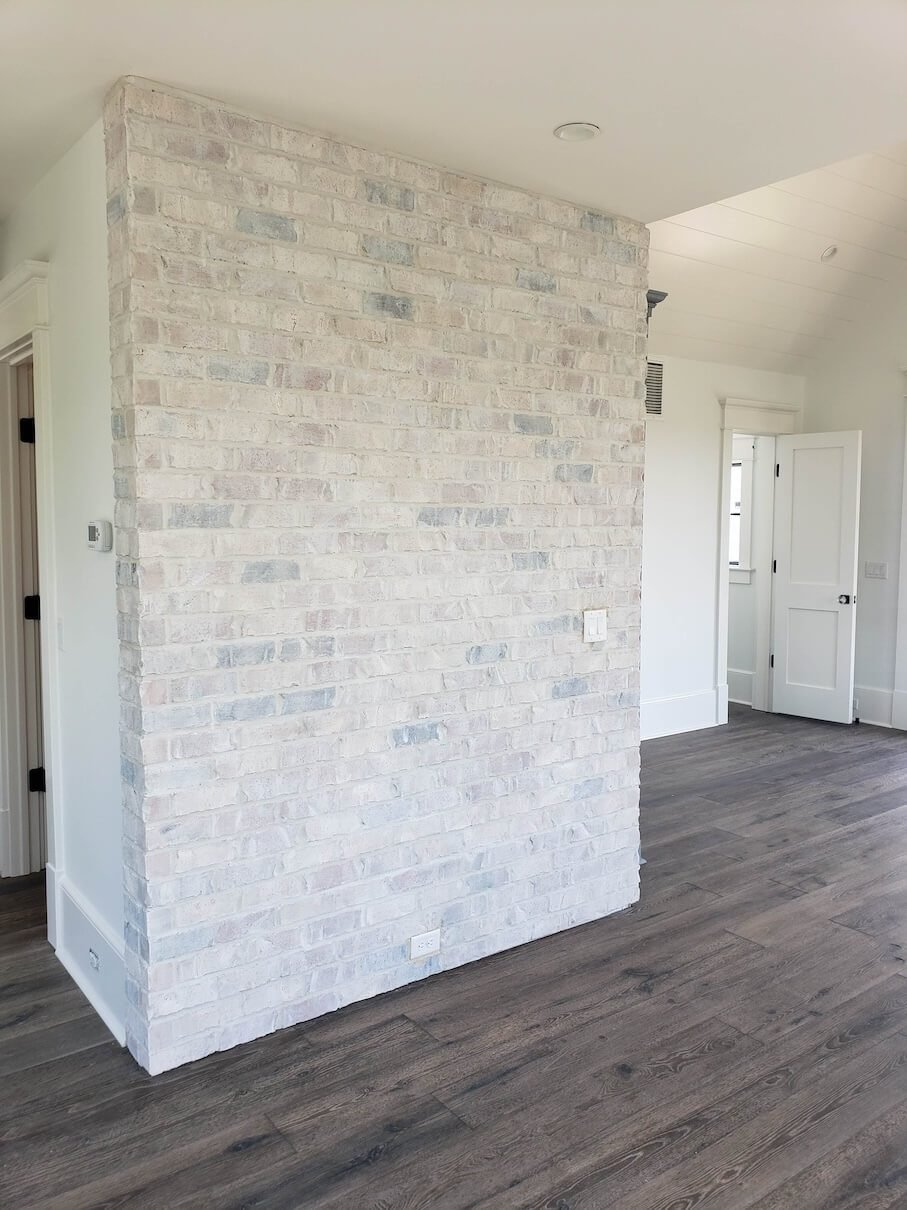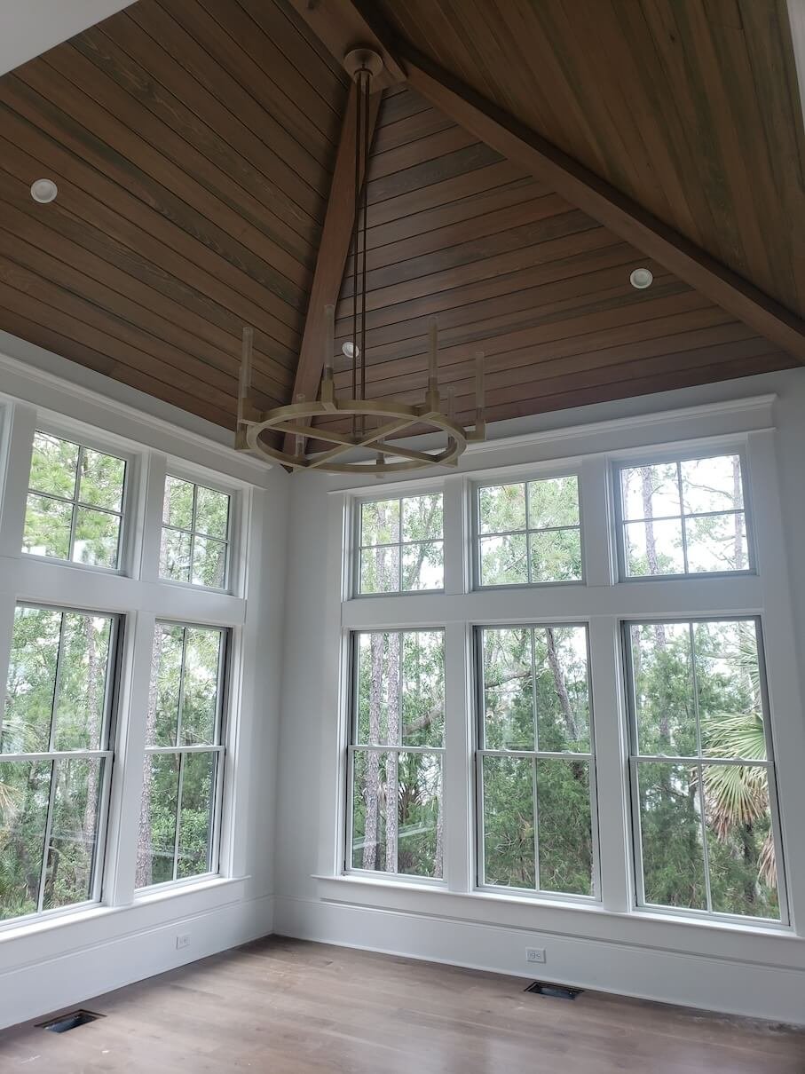 Interior Painting Services: Our Mount Pleasant painting team delivered outstanding results featuring stunning wood plank ceilings with natural stain finishes throughout main living areas creating warmth and elegance, dramatic white brick accent walls providing modern texture and visual interest, and cathedral ceilings with exposed beams requiring precision staining and paint coordination. The home includes multiple staircases with sleek black metal railings contrasting against pristine white walls, elegant hallways with modern black barn doors and smooth wall finishes, and coordinated neutral color palettes maximizing the abundant natural light. Floor-to-ceiling windows throughout required meticulous trim work and paint detailing.