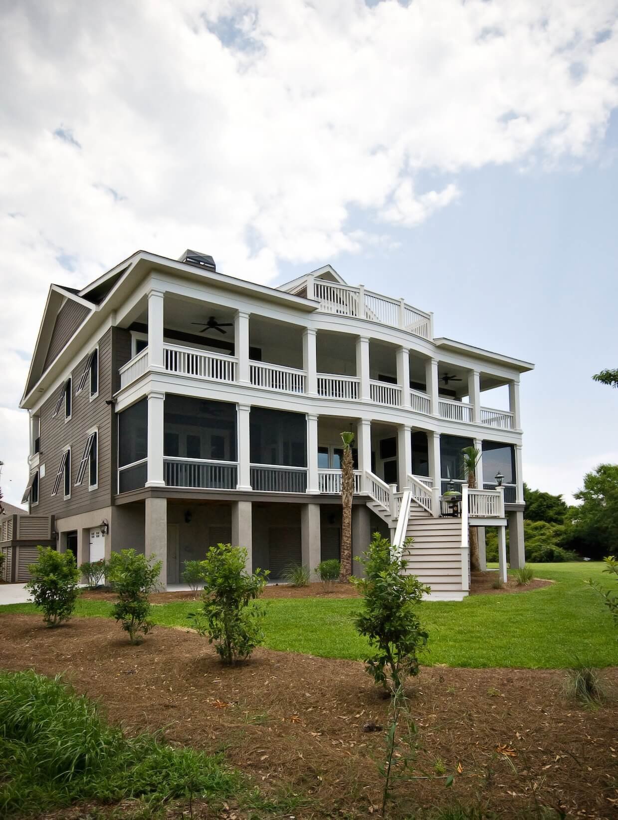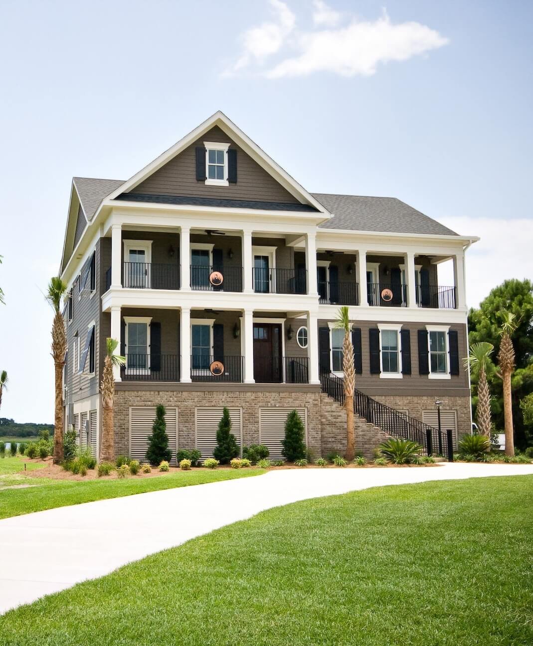 Exterior Painting: The stunning Lowcountry exterior showcases classic elevated architecture with multiple levels of wrap-around porches and balconies painted in soft sage green tones, extensive white trim work including columns, railings, and architectural details throughout all three levels, and premium weather-resistant finishes designed specifically for Kiawah Island’s oceanfront environment. Our Charleston painting contractors completed all exterior surfaces to perfection.