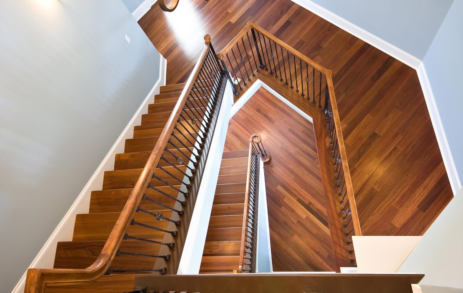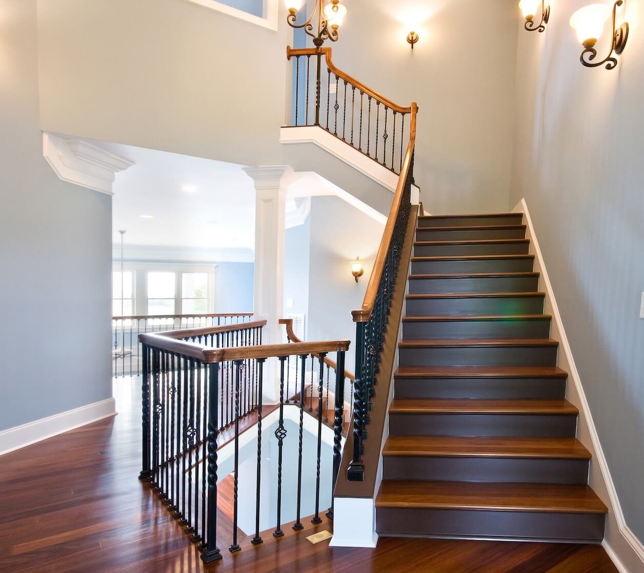 Interior Painting Services: Our painting team delivered outstanding results featuring a dramatic two-story entry with grand staircase painted in elegant blue-gray tones creating sophisticated ambiance, natural wood staircase with rich stain finishes and metal railings requiring precision detailing, and smooth wall finishes with expert color transitions throughout multiple levels. The expansive interior includes coordinated color palettes, flawless trim work on all architectural details, and premium paint application designed for luxury coastal living.