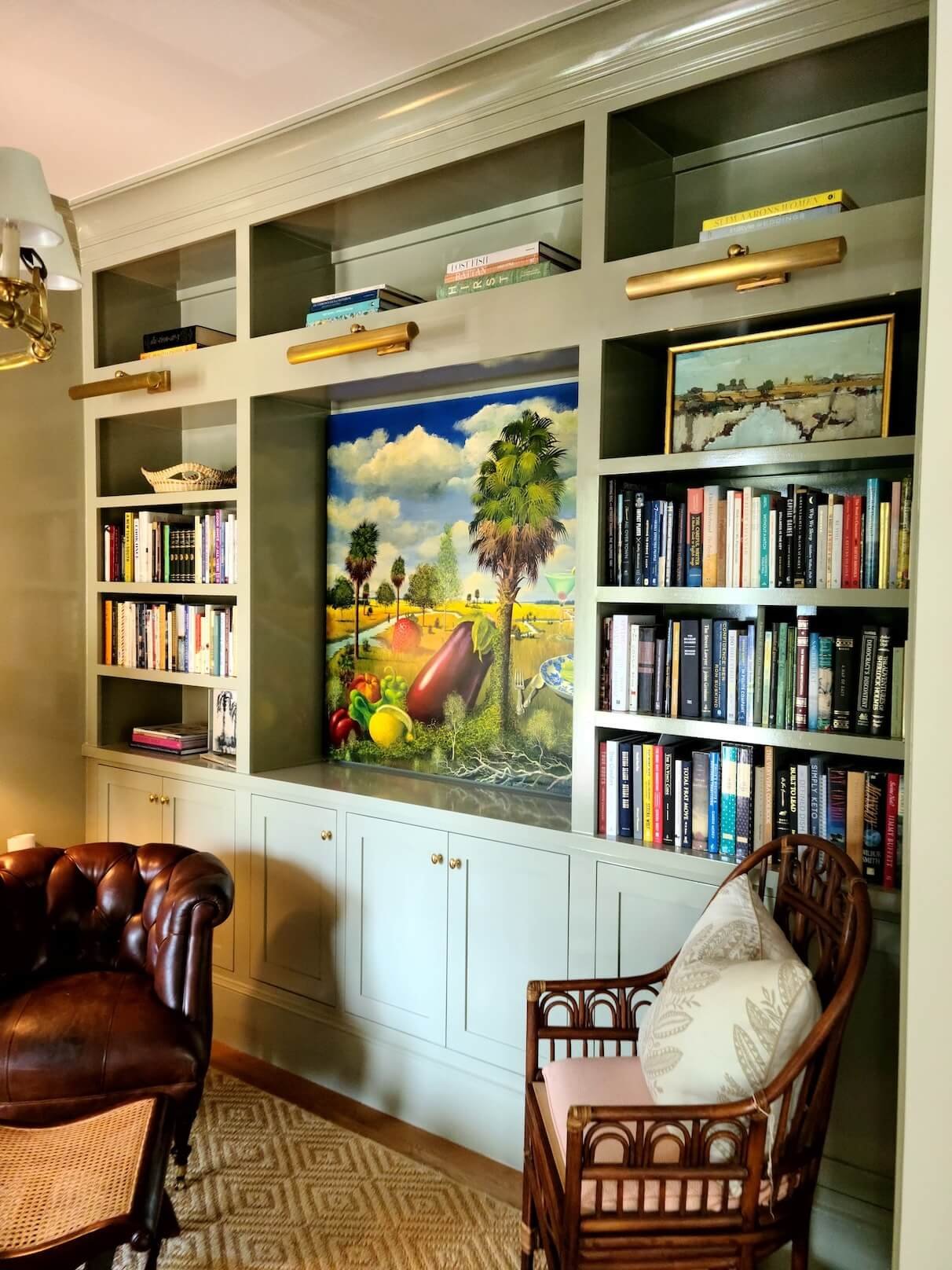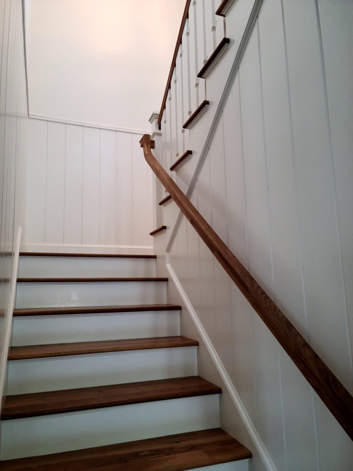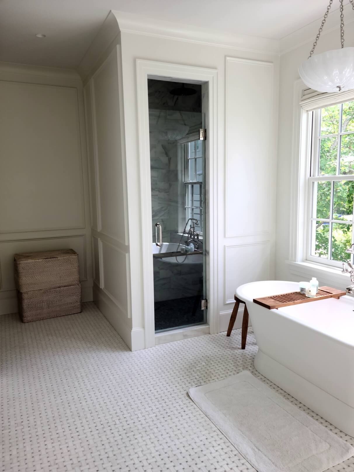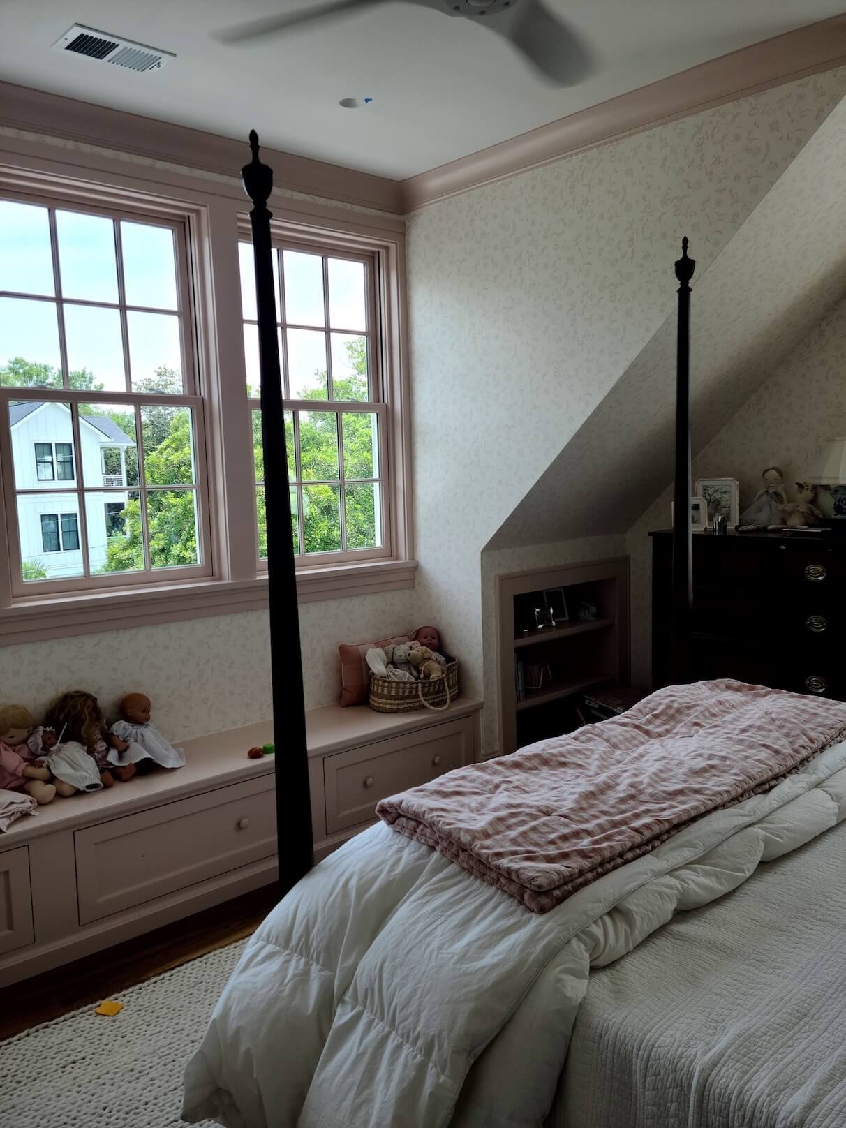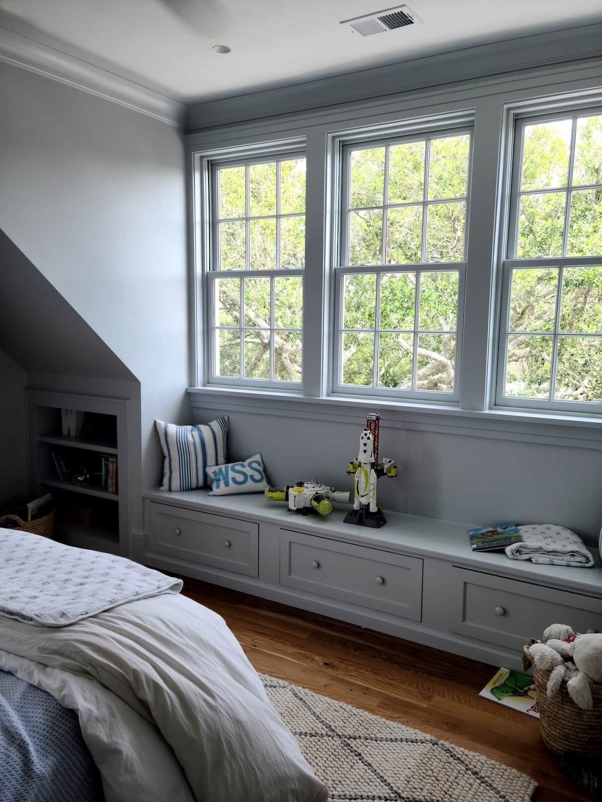 Interior Painting Services: Our painting team delivered exceptional results preserving the home’s historic character while providing fresh, modern finishes. The project includes elegant living areas with custom built-in bookshelves and cabinetry painted in soft neutrals, sophisticated bedrooms featuring custom gray built-in window seats and storage with precision paint application, and classic staircase with crisp white risers and walls complementing natural wood handrails. The master bathroom showcases pristine white finishes with detailed trim work, while multiple rooms feature coordinated color palettes in soft grays and warm whites creating a timeless aesthetic.