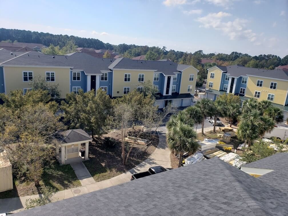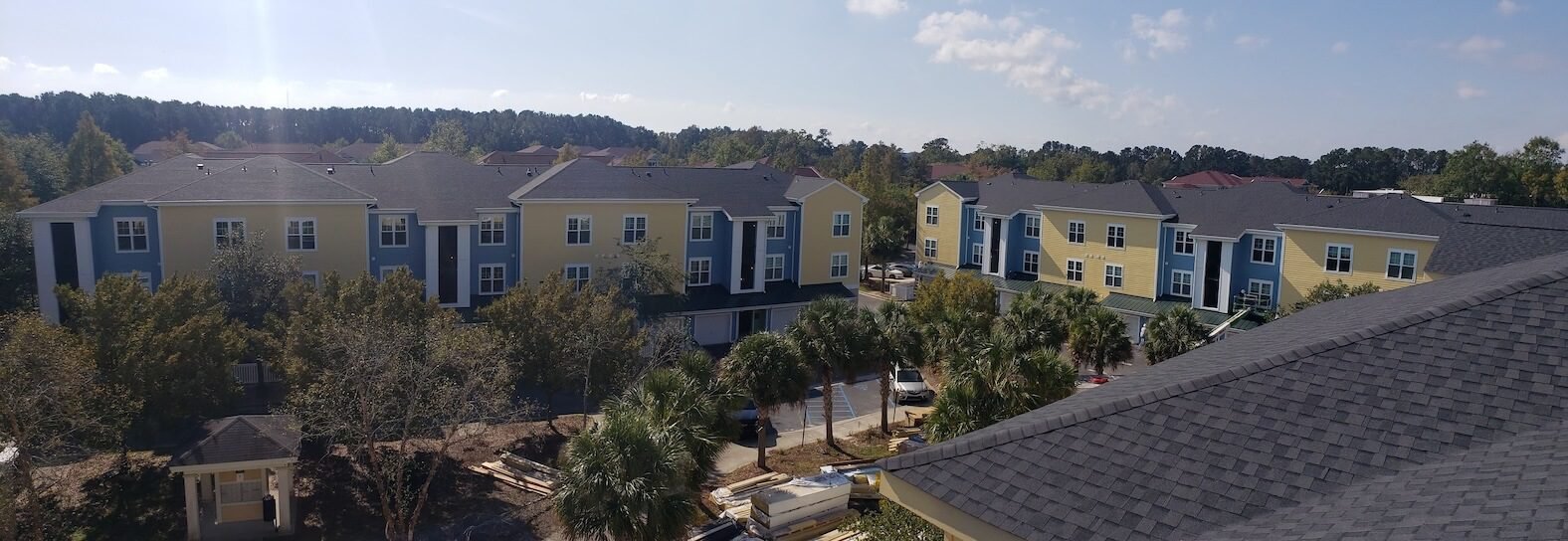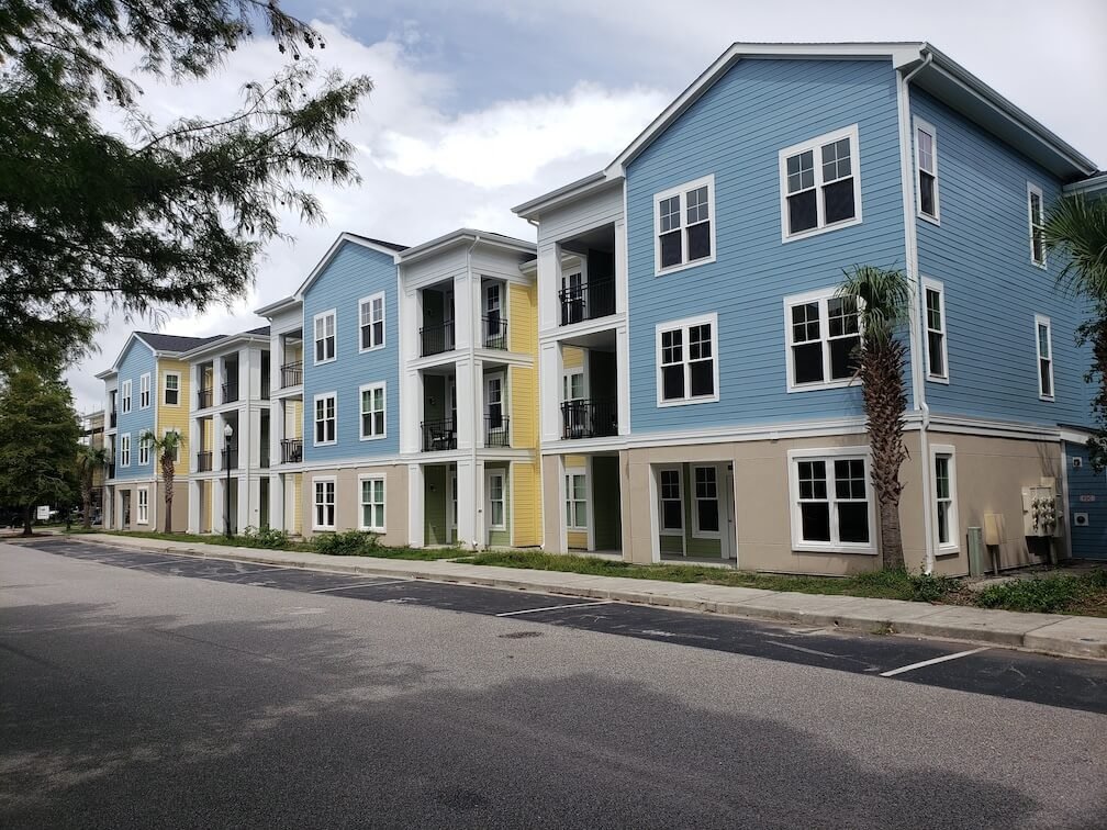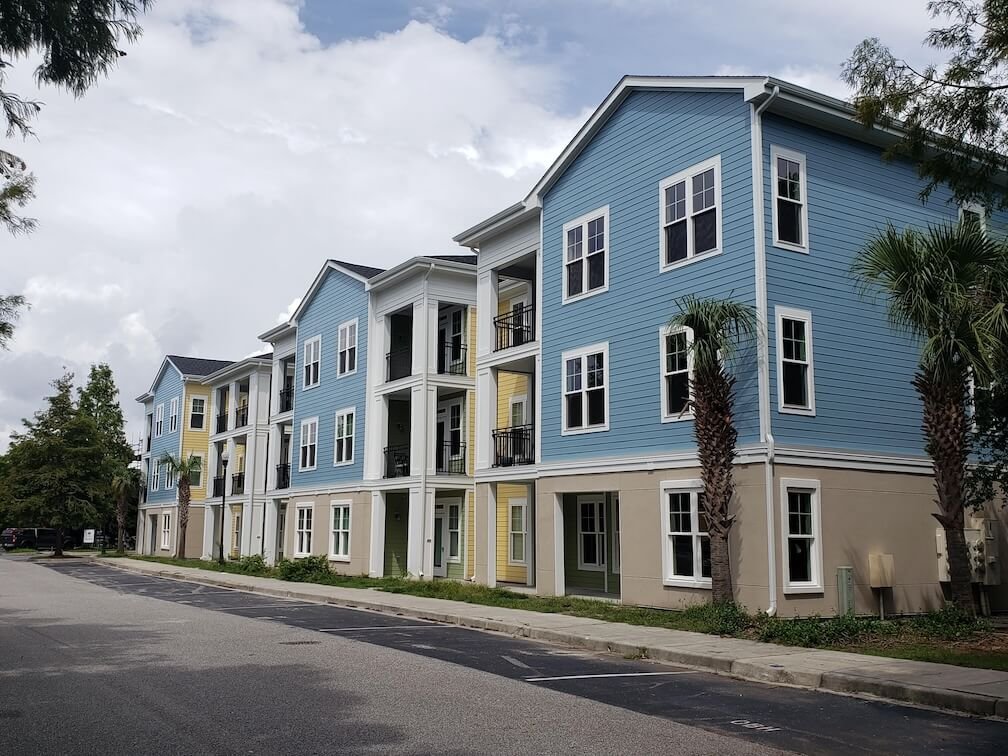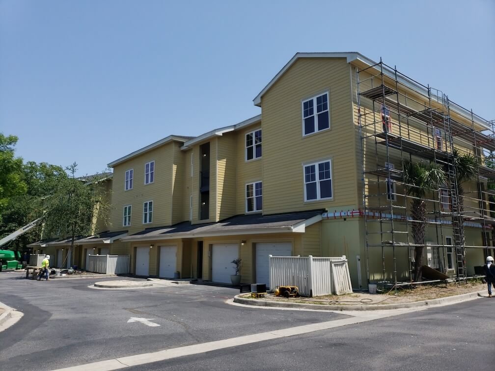 Commercial Exterior Painting Services: Our commercial painting team successfully completed this multi-building condominium complex featuring vibrant coastal color palette including soft blue, sunny yellow, and warm tan tones across multiple buildings, premium weather-resistant paint systems designed for Charleston’s coastal climate and high-traffic areas, and extensive trim work, balconies, railings, and architectural details throughout the complex. The project required careful coordination, safety protocols, and efficient execution to meet construction deadlines while maintaining quality standards.