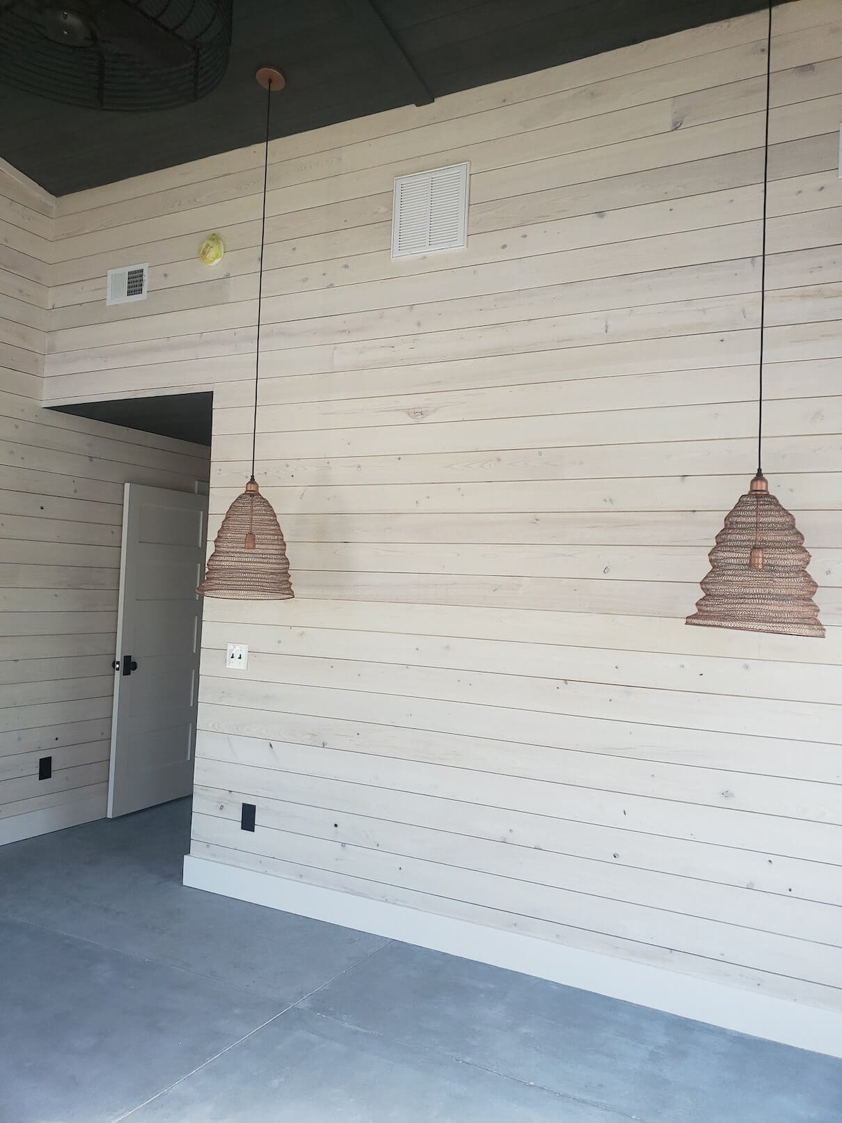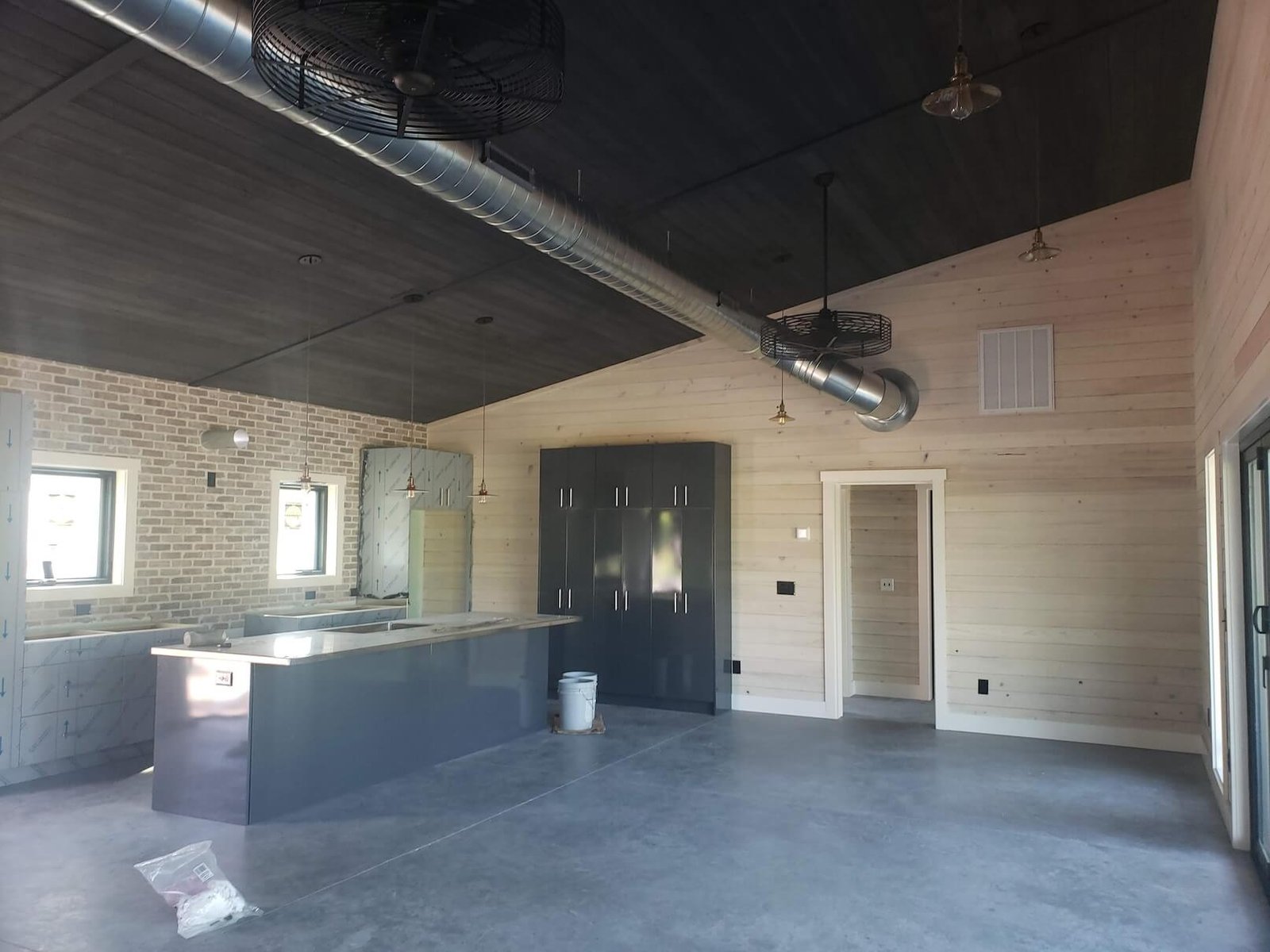 Interior Painting Services: Our painting team delivered a sophisticated modern interior featuring dramatic black painted ceilings throughout the main living areas, creating stunning contrast with bright white shiplap walls and smooth finishes across all interior spaces. The open-concept design required precise paint application to maintain clean lines and seamless color transitions between the bold ceiling and crisp wall finishes.