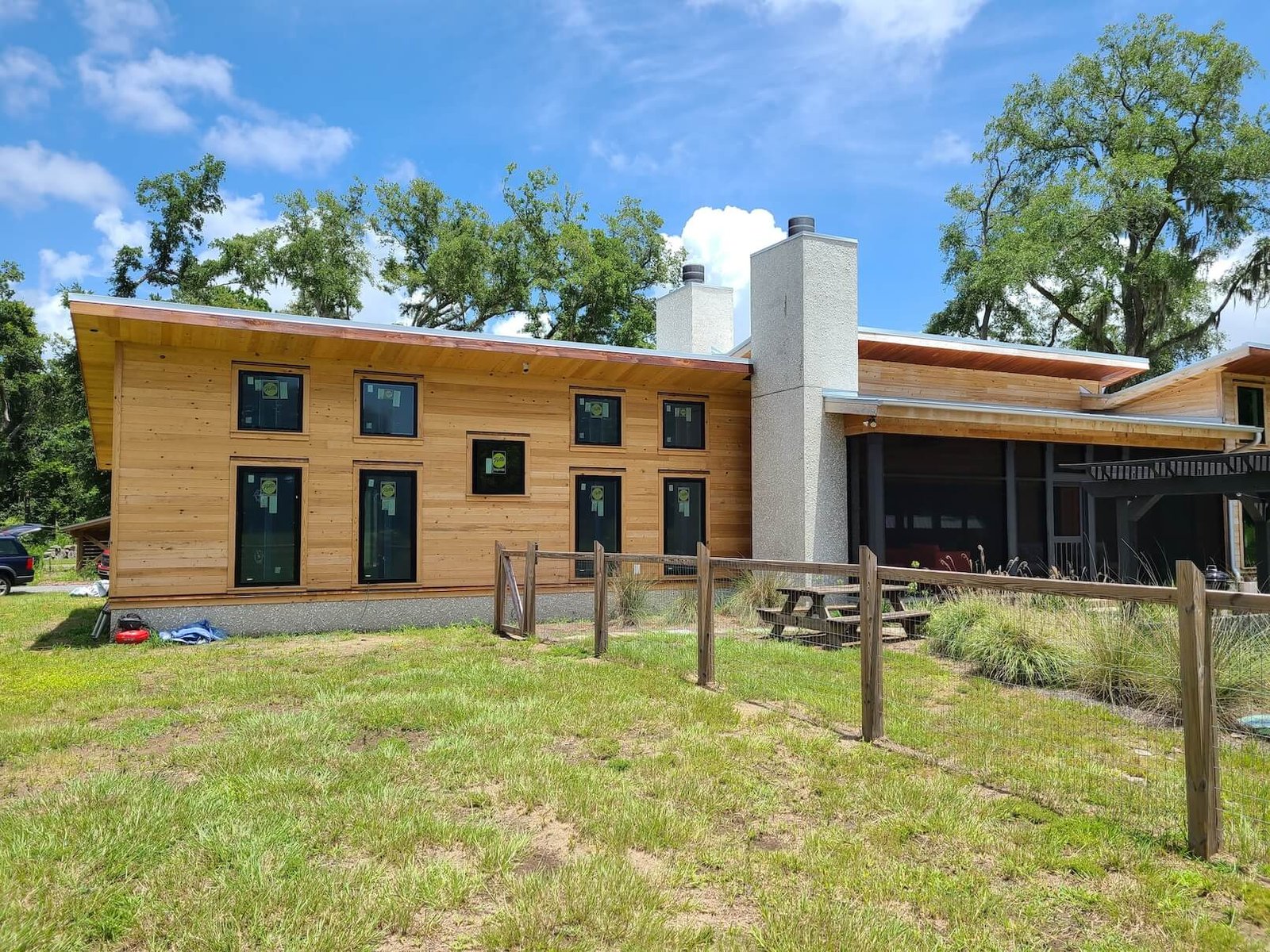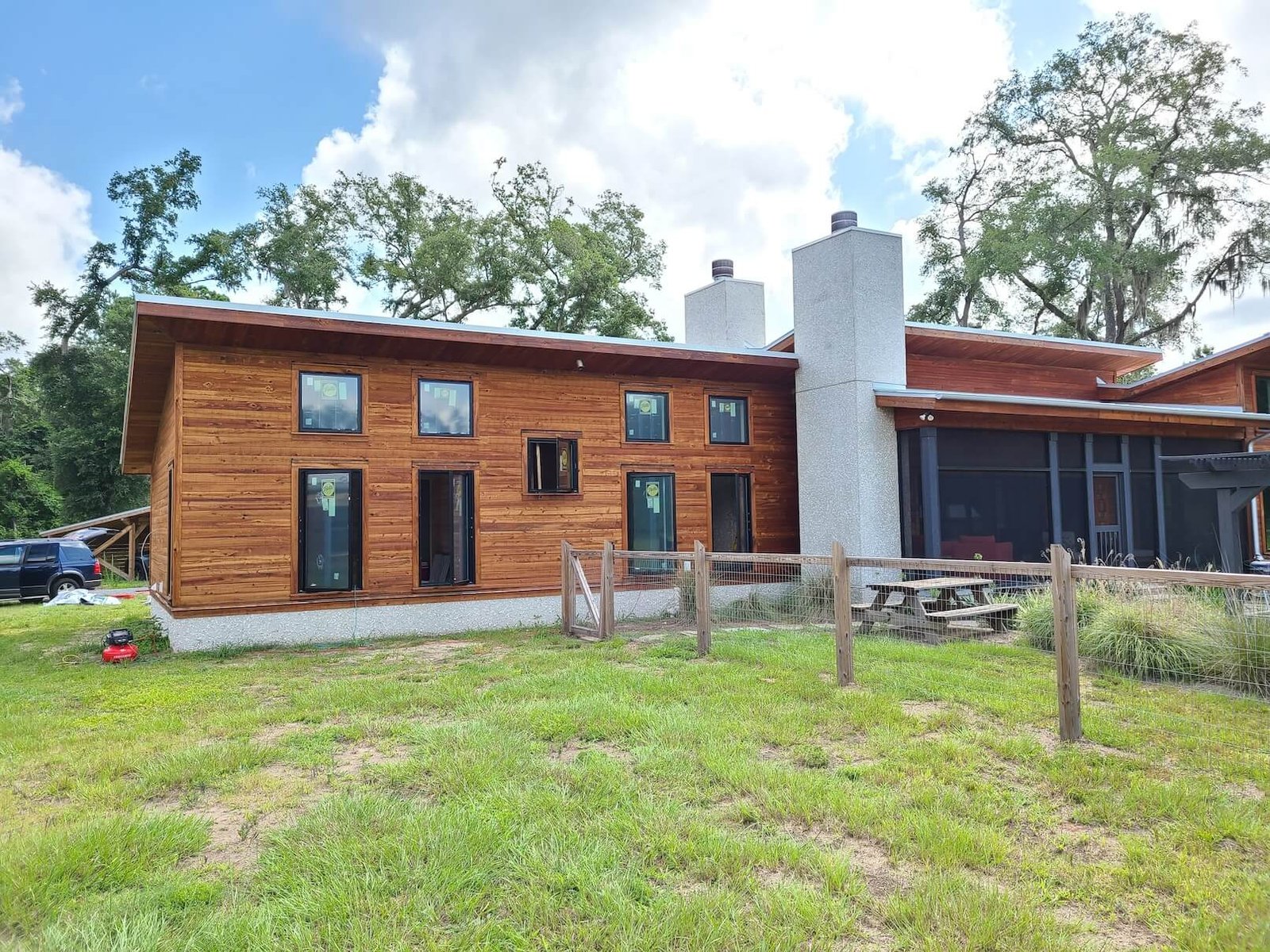 Exterior Painting: The exterior transformation includes a unique contemporary color palette with warm terracotta and gold tones on stucco surfaces, natural wood siding stain in rich brown tones providing organic warmth, and modern black window frames and trim creating striking architectural definition. Our Charleston painting contractors applied premium weather-resistant products designed to protect against South Carolina’s climate while maintaining the home’s bold aesthetic.