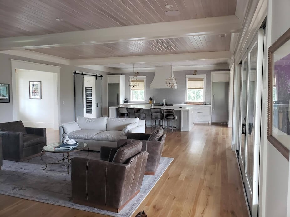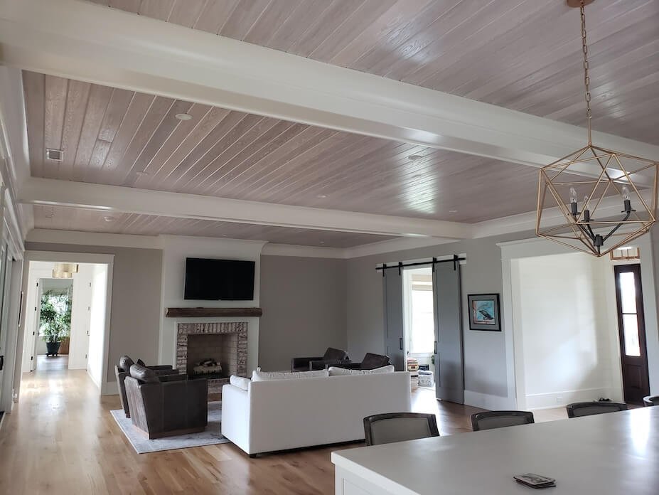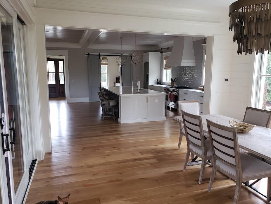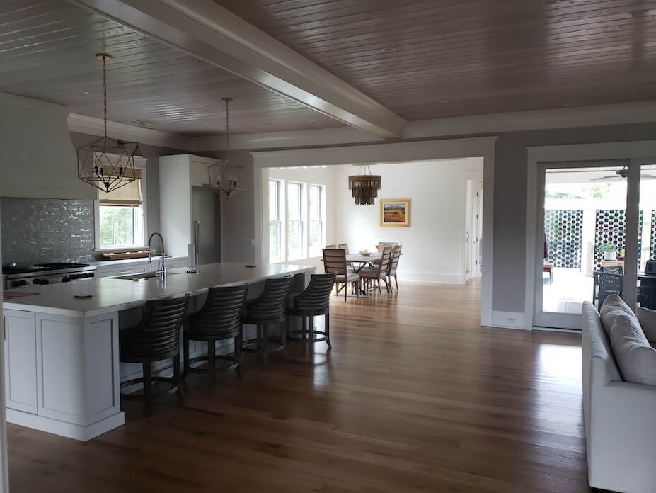 Interior Painting Services: Our Sullivan Island painting team expertly completed this open-concept home, featuring stunning wood plank ceilings with precision staining throughout the main living areas, crisp white walls that maximize natural light and coastal ambiance, elegant staircase with natural wood treads and modern black metal railings, and custom barn doors painted in sophisticated gray tones with black hardware. The gourmet kitchen includes pristine white cabinetry and island with flawless paint application, while multiple living and dining areas flow seamlessly with coordinated color palettes and professional finishes.