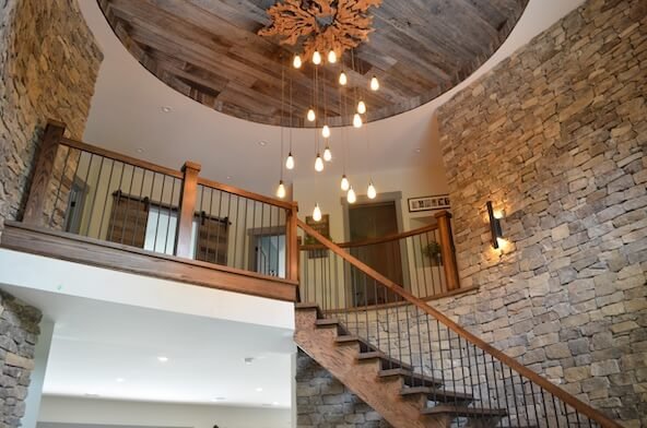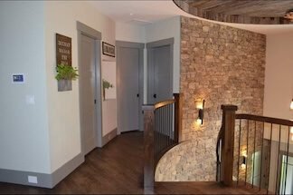 Interior Painting Services: Our professional painting team delivered exceptional results throughout this multi-level home, featuring dramatic two-story entry with curved staircase and exposed stone accent wall, open-concept living areas with cathedral ceilings and modern color palette, crisp white walls contrasting beautifully with natural wood staircase railings, and multiple rooms with precision trim work and smooth finishes. The interior design combines contemporary style with rustic elements, requiring expert paint application and attention to detail.