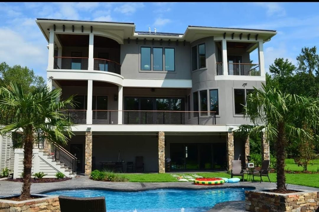 Exterior Painting: The striking modern exterior features a sophisticated dark gray color scheme with contrasting trim and natural stone accents. Our Summerville painting contractors applied premium weather-resistant finishes to all three levels, including extensive trim work, covered patios and balconies, and architectural details. The home’s bold contemporary design required precise color transitions and flawless application.