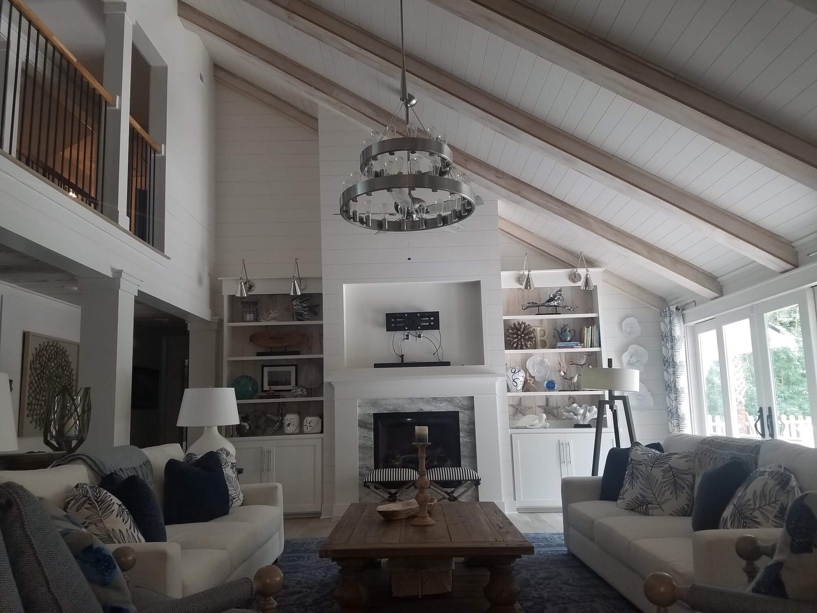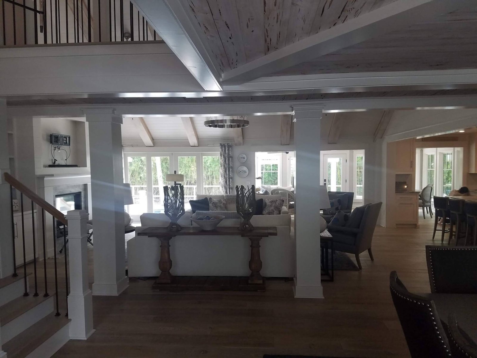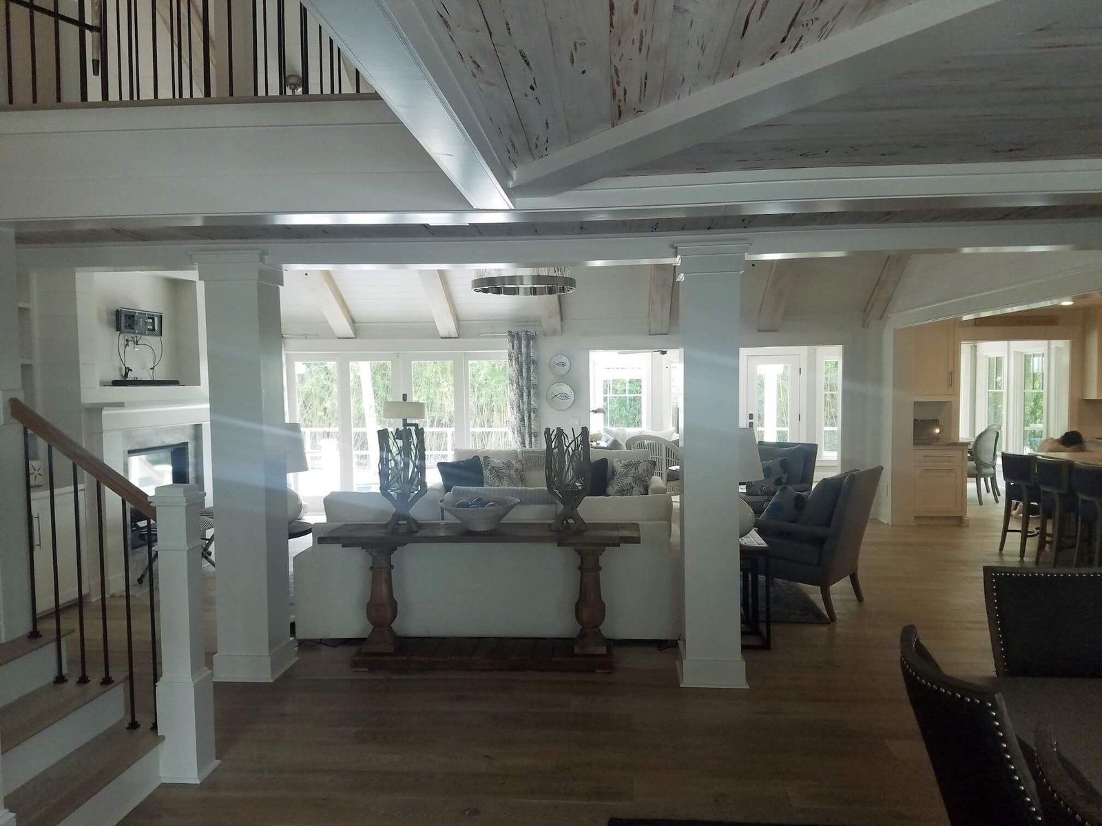 Interior Painting Services: Our team expertly painted the entire home, including master and guest bedrooms with crisp white trim, long hallways with smooth finishes, and stunning open-concept living areas featuring cathedral ceilings and exposed beam painting. The modern kitchen and dining spaces received precision wall and trim work, creating a cohesive coastal aesthetic throughout.