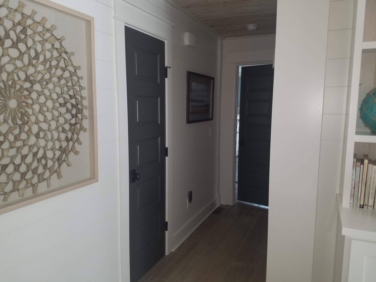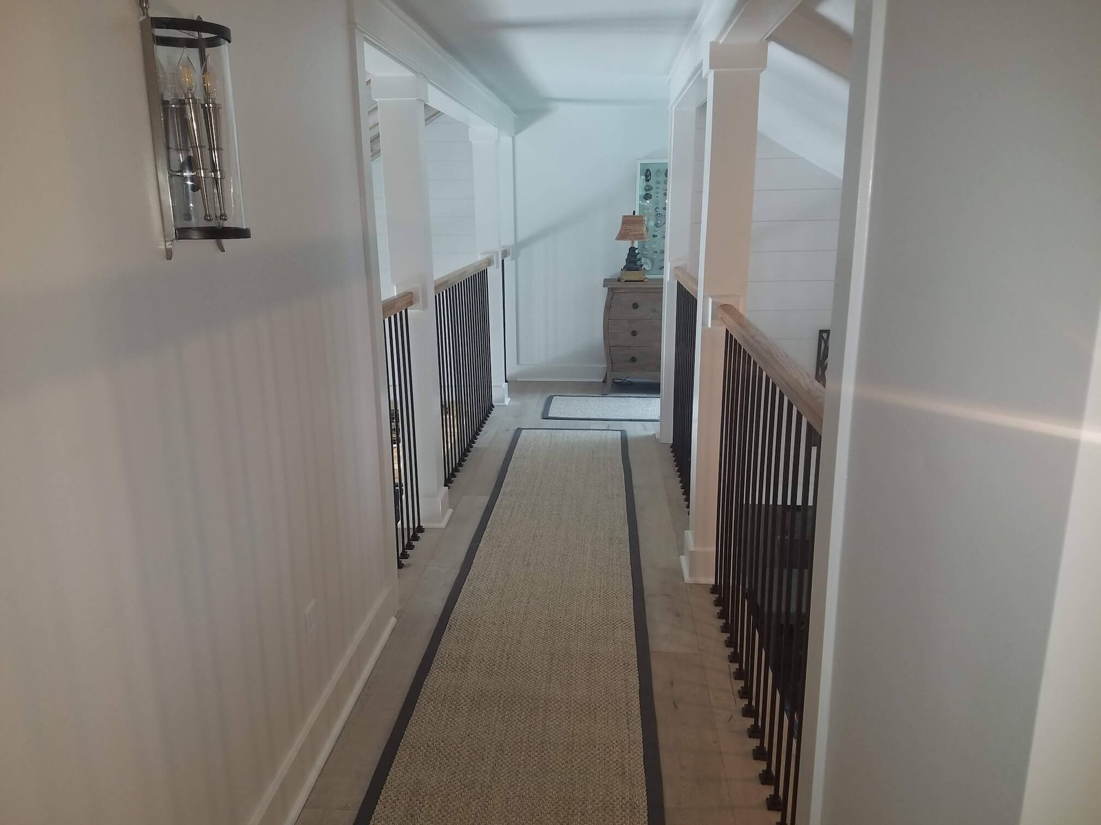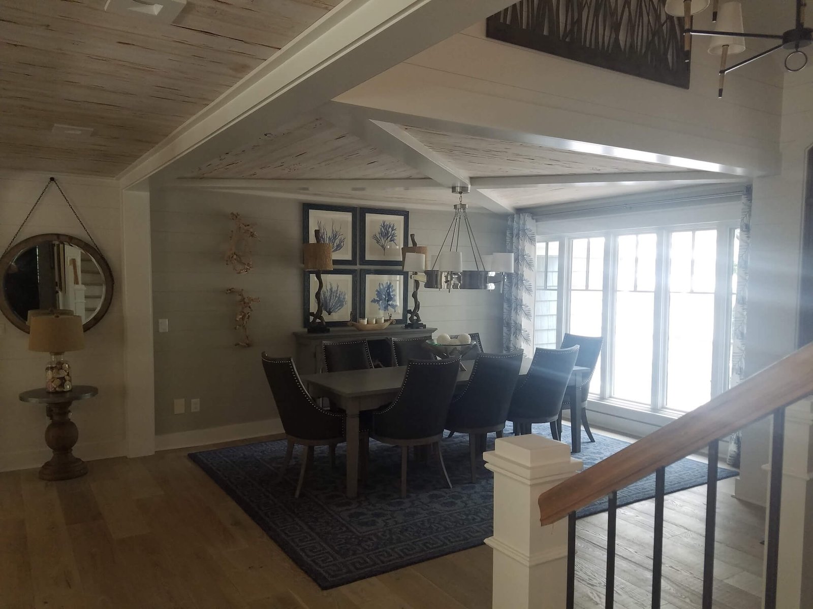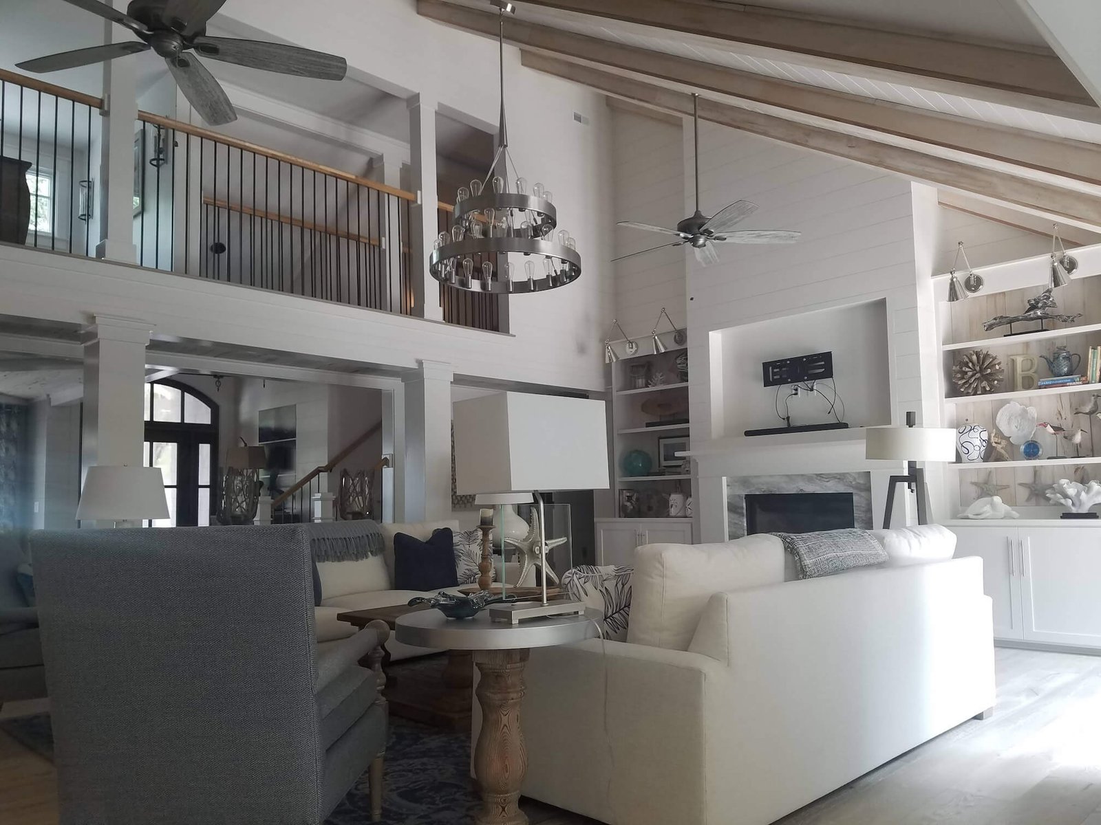 Interior Painting Services: Our team expertly painted the entire home, including master and guest bedrooms with crisp white trim, long hallways with smooth finishes, and stunning open-concept living areas featuring cathedral ceilings and exposed beam painting. The modern kitchen and dining spaces received precision wall and trim work, creating a cohesive coastal aesthetic throughout.