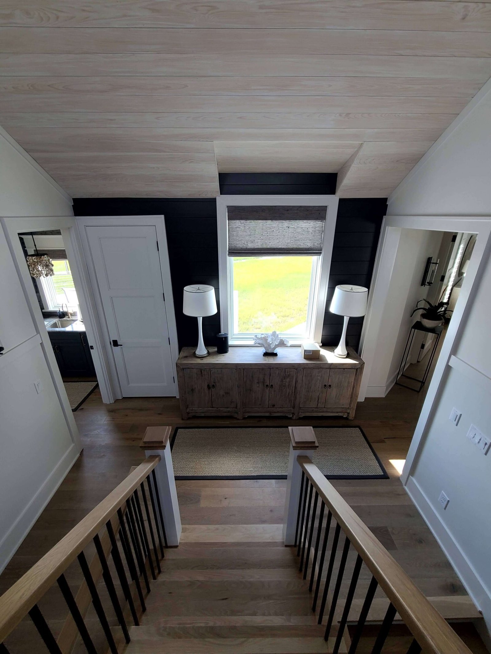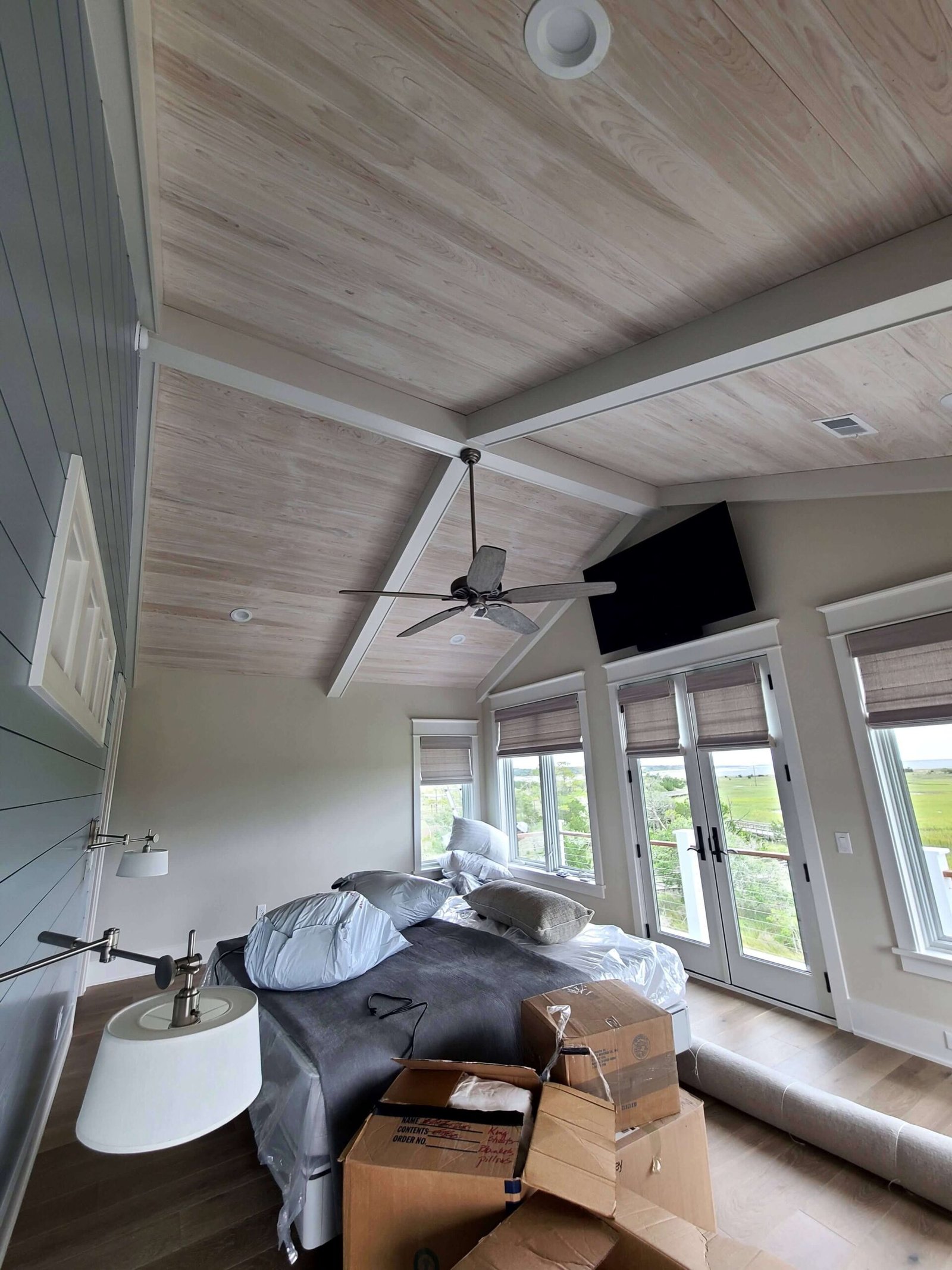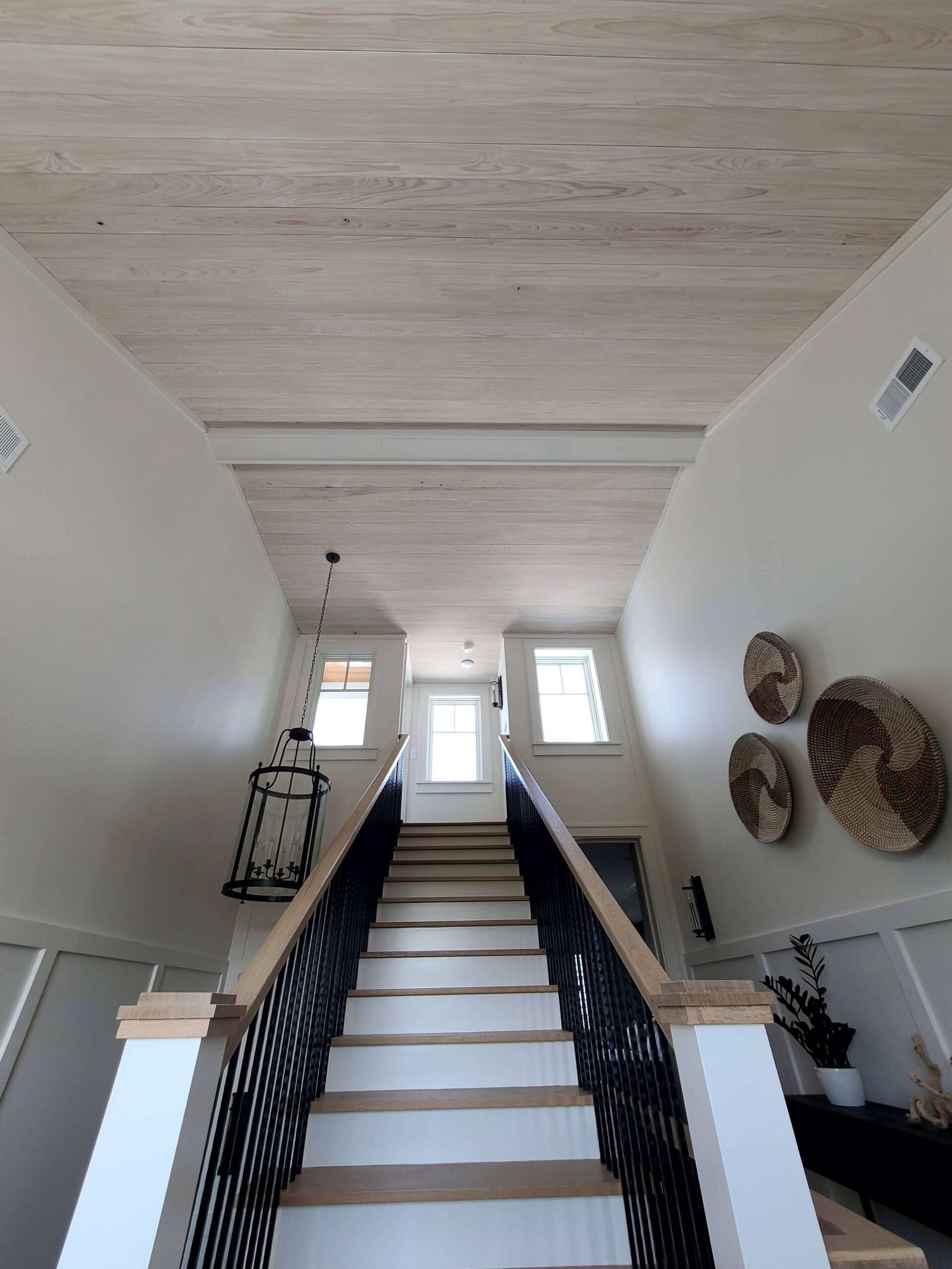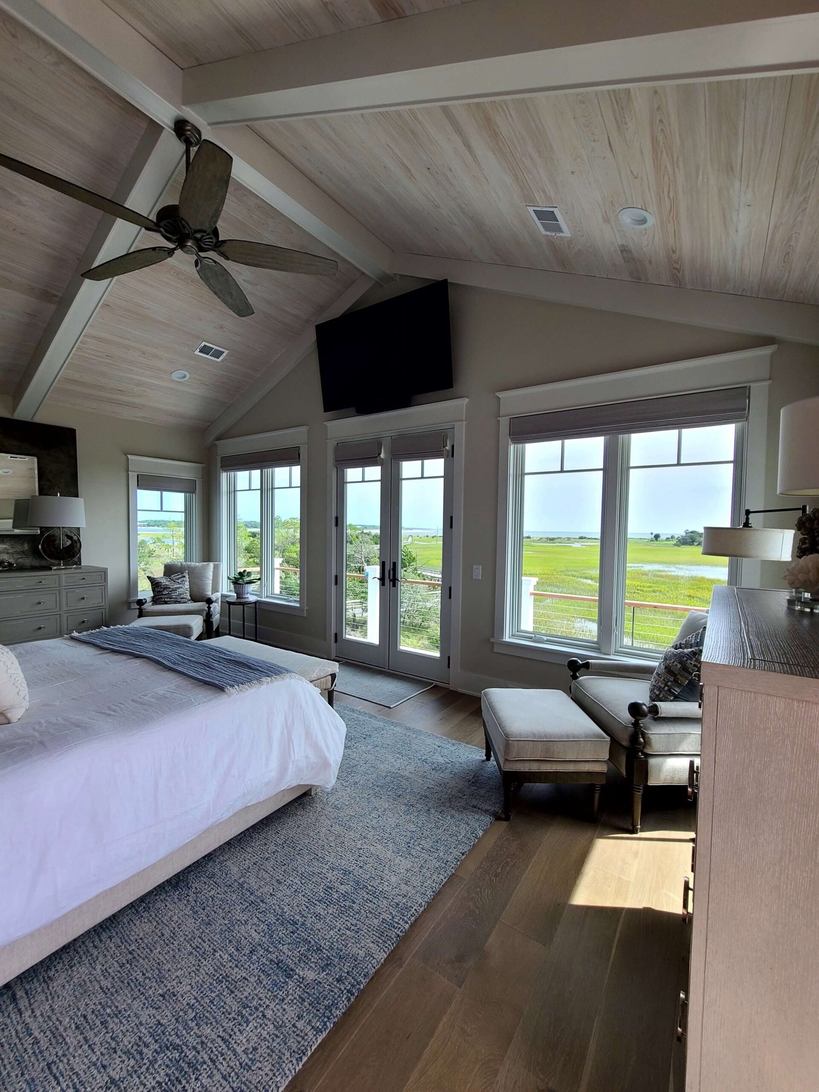 Interior Painting Services: Our Charleston painting contractors expertly painted multiple bedrooms featuring custom color palettes including sophisticated blues, soft grays, and crisp whites. The home showcases impressive wood plank ceilings with precision staining, dramatic two-story staircases with contrasting black railings and white risers, and elegant built-in shelving units. Long hallways received flawless finishes, while the spacious open-concept living areas with ocean views were painted to maximize natural light and coastal ambiance.