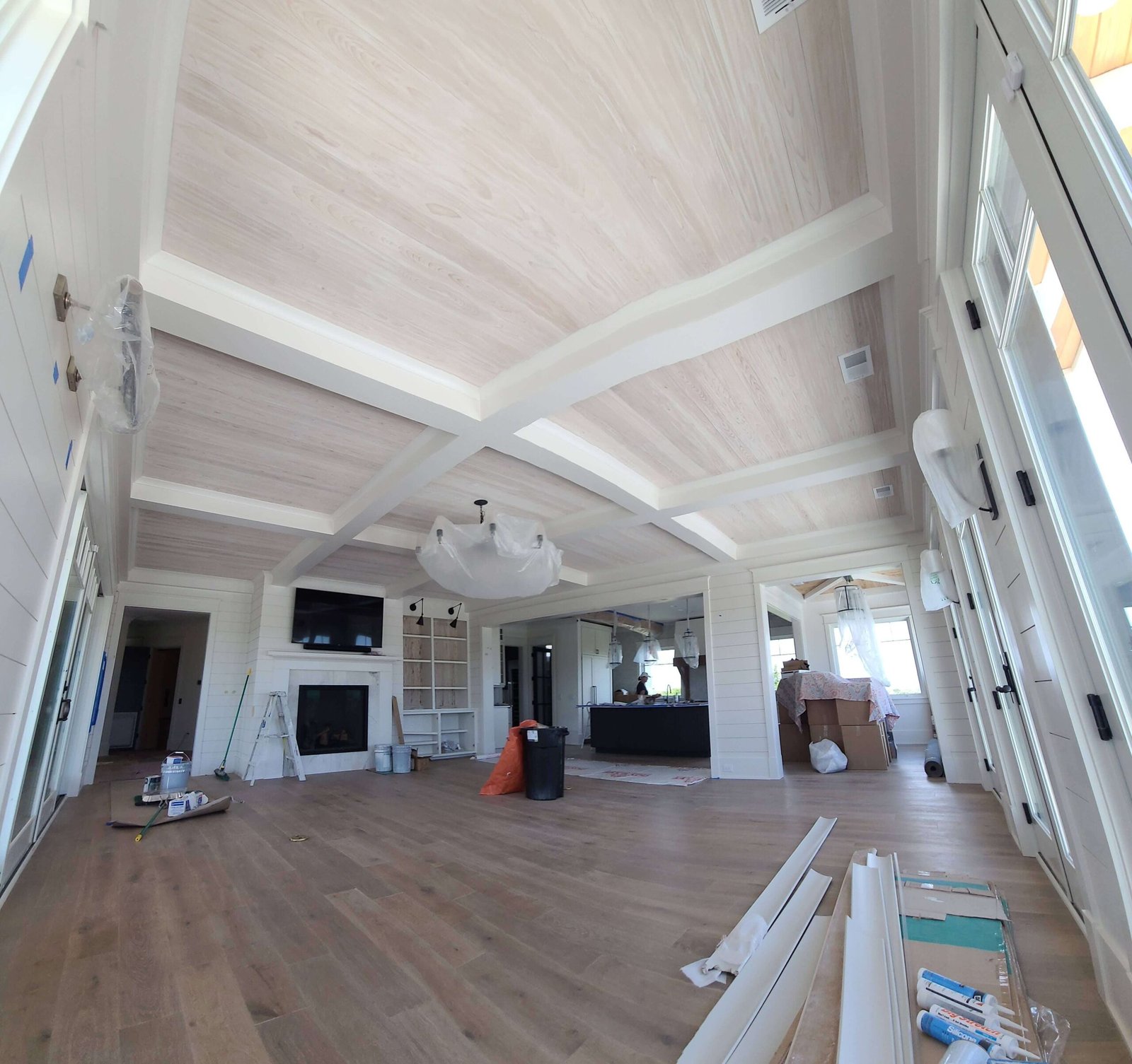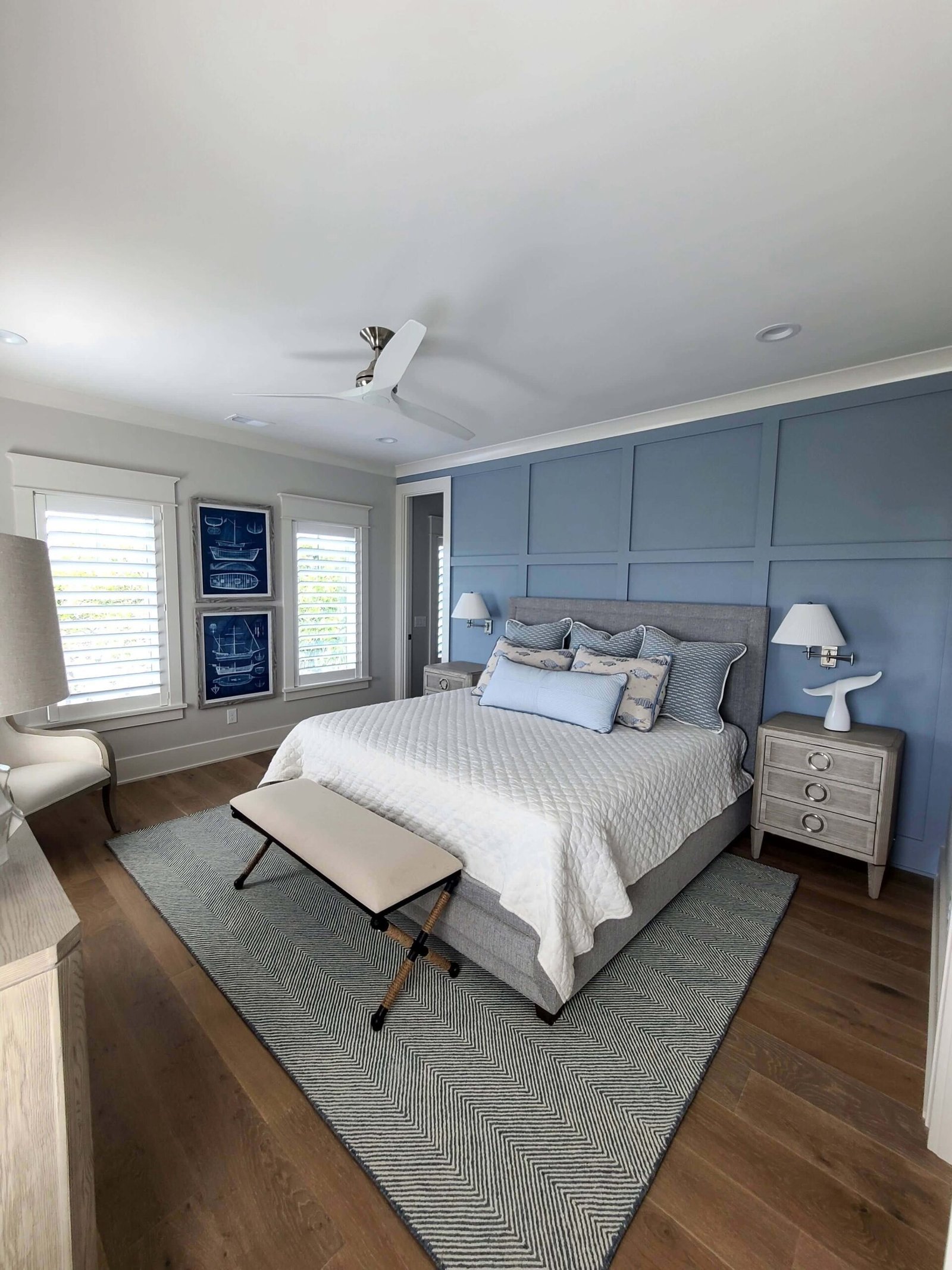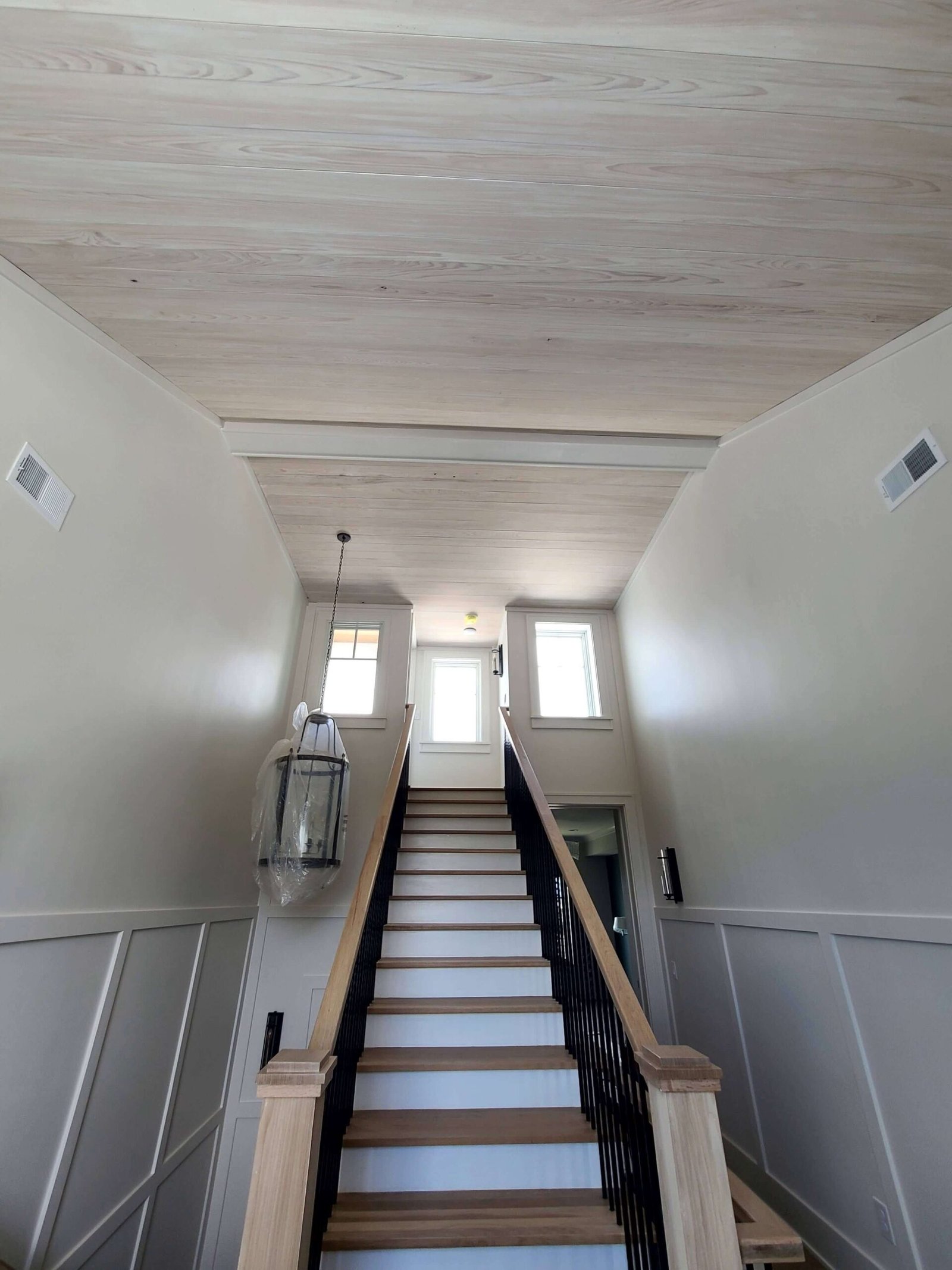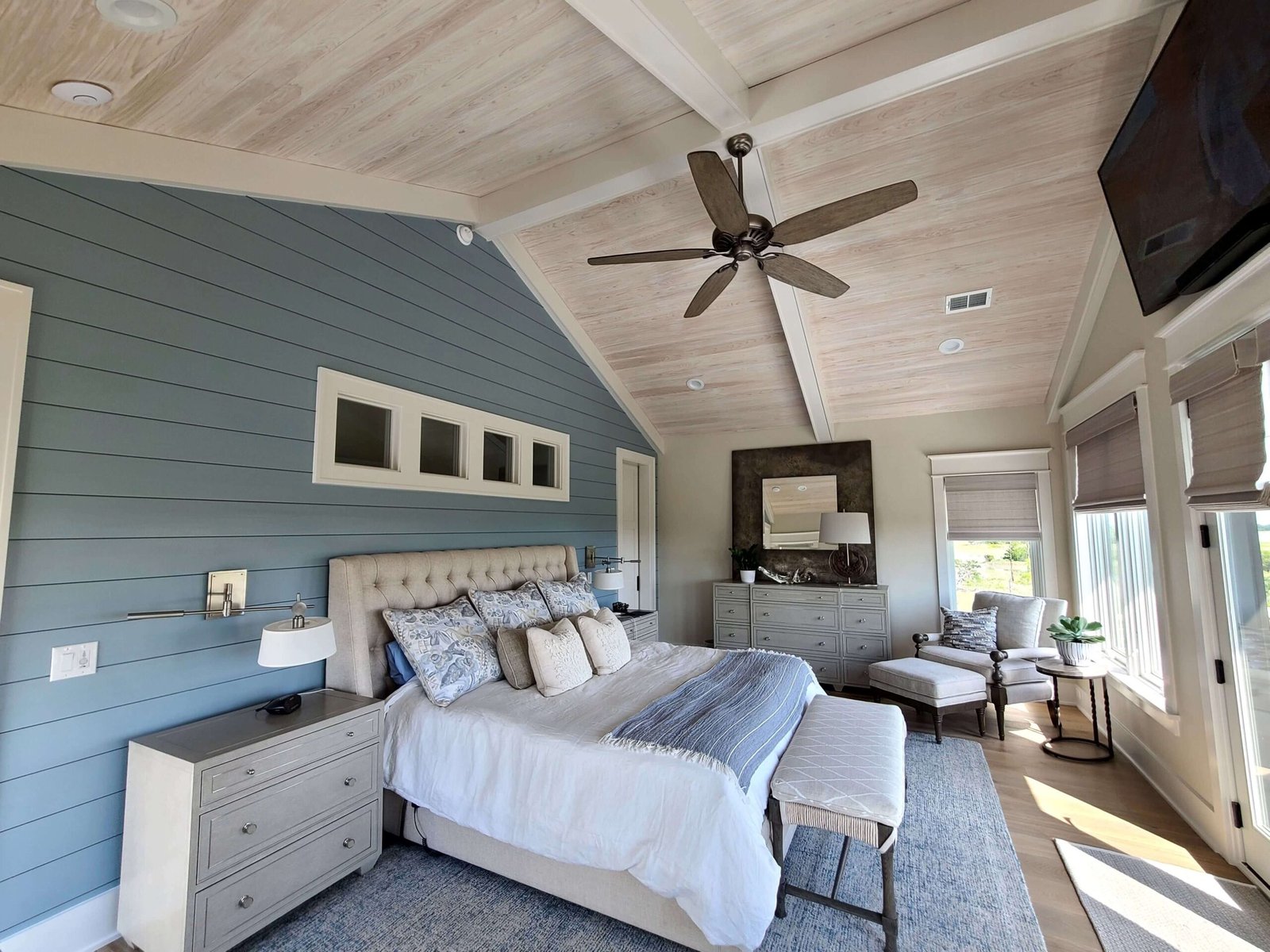 Interior Painting Services: Our Charleston painting contractors expertly painted multiple bedrooms featuring custom color palettes including sophisticated blues, soft grays, and crisp whites. The home showcases impressive wood plank ceilings with precision staining, dramatic two-story staircases with contrasting black railings and white risers, and elegant built-in shelving units. Long hallways received flawless finishes, while the spacious open-concept living areas with ocean views were painted to maximize natural light and coastal ambiance.