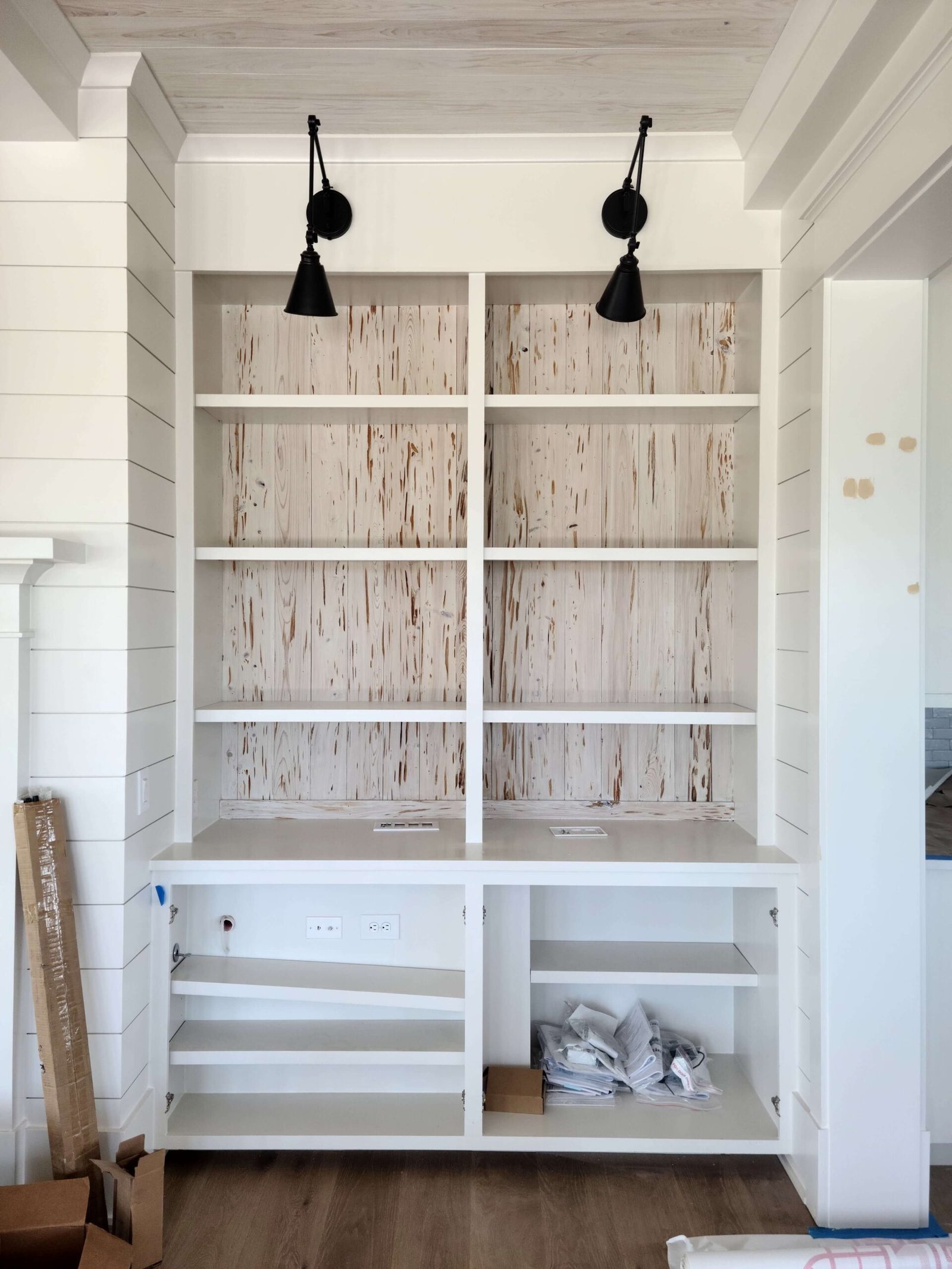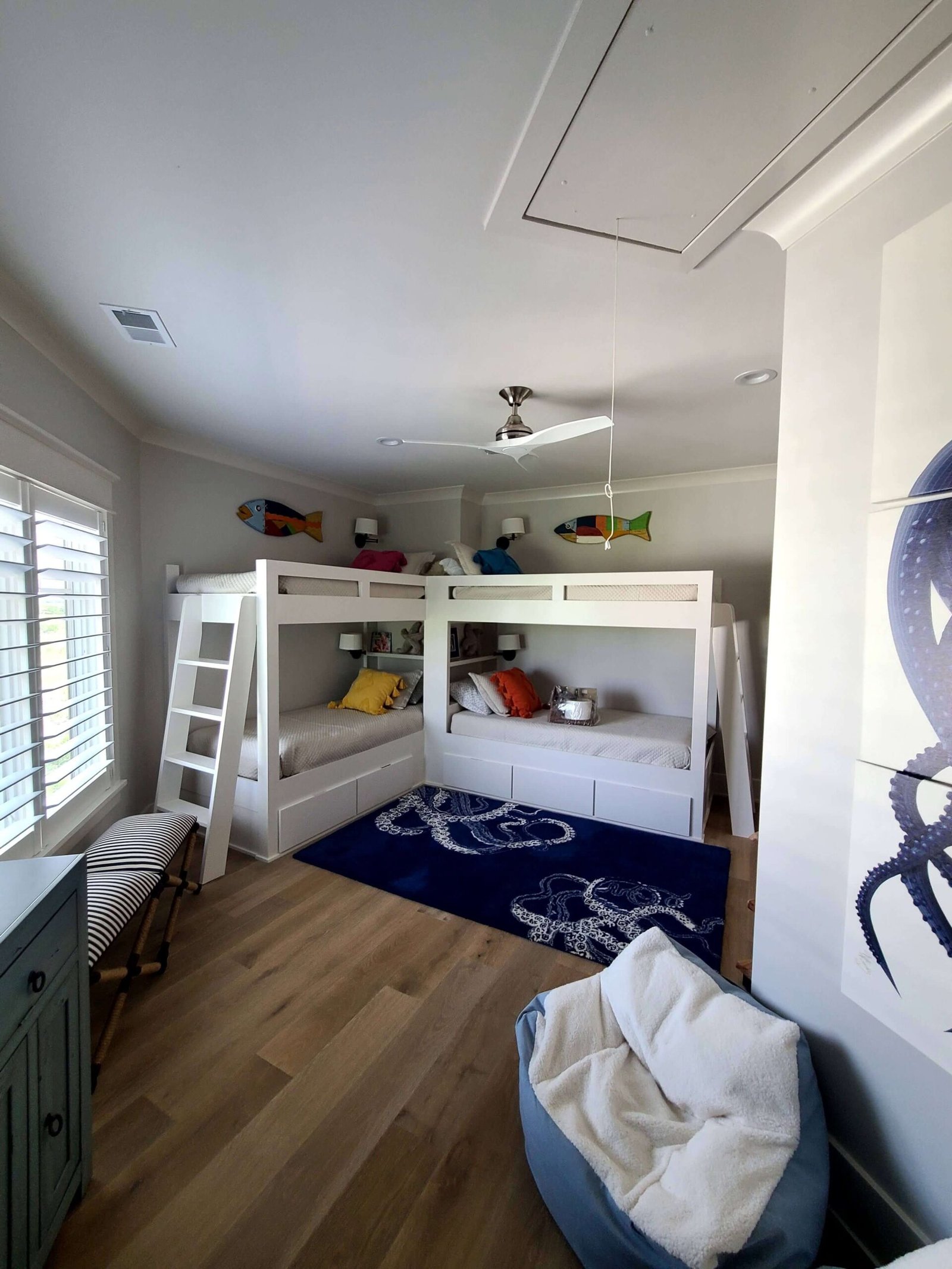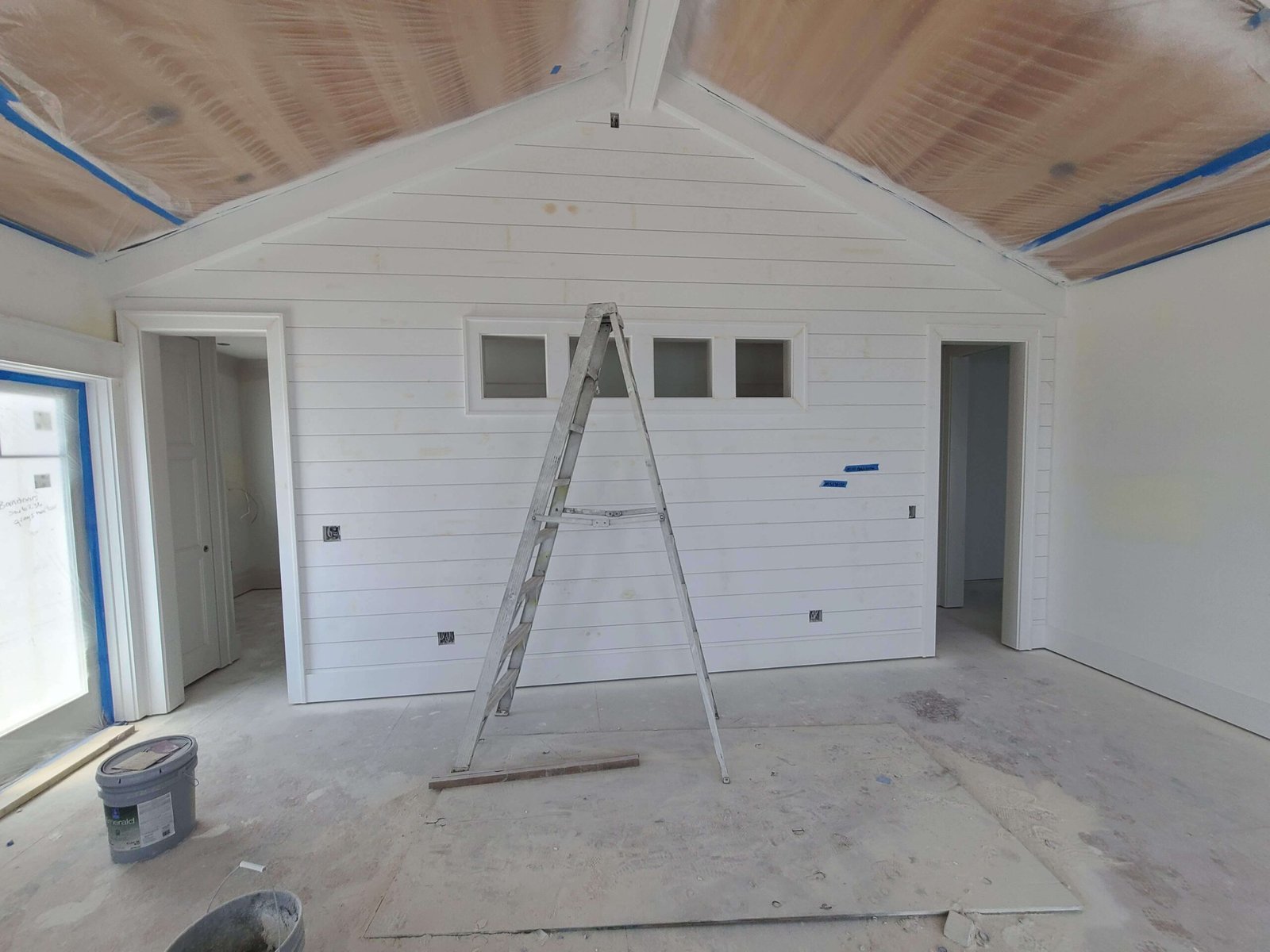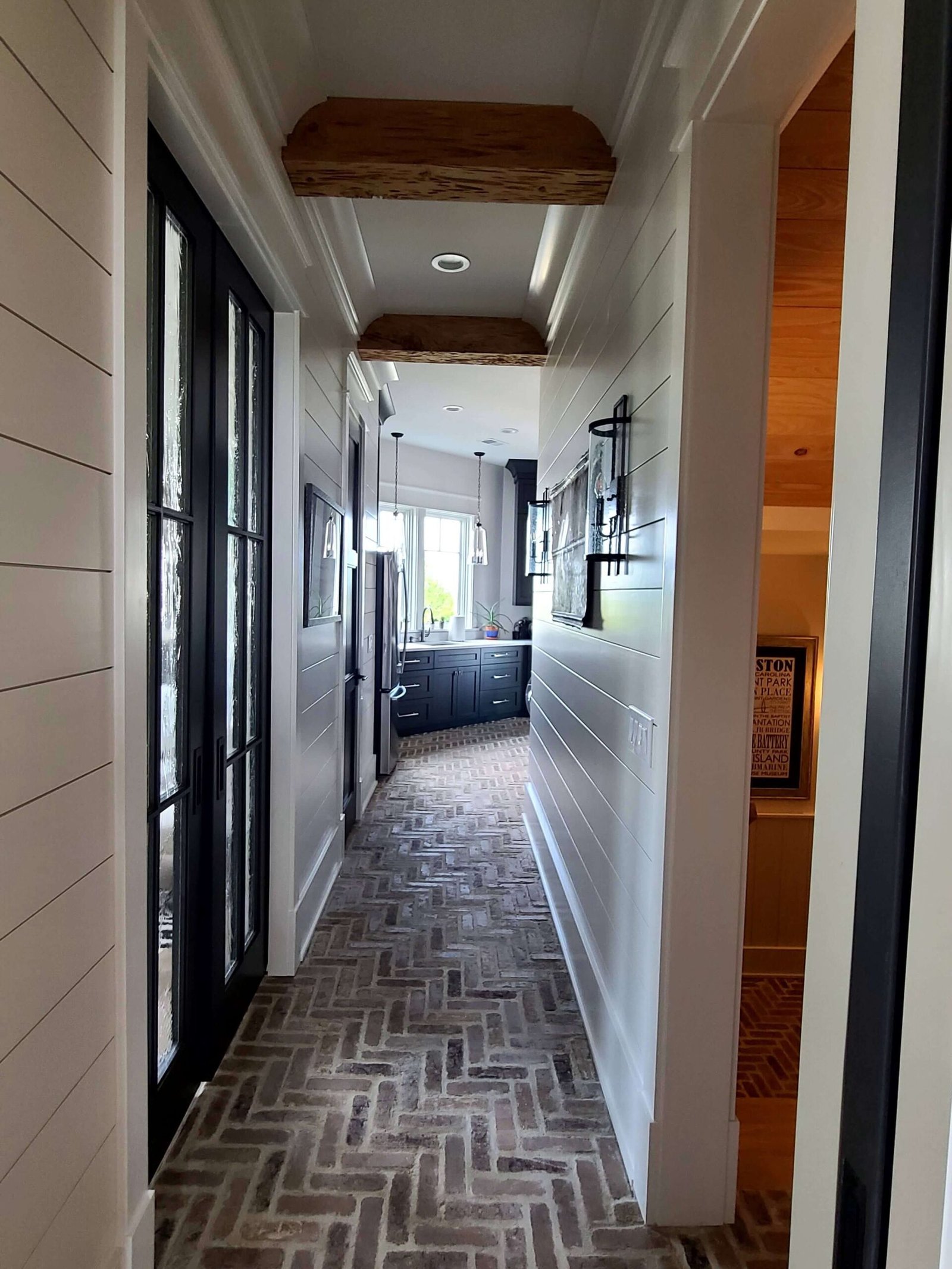 Interior Painting Services: Our Charleston painting contractors expertly painted multiple bedrooms featuring custom color palettes including sophisticated blues, soft grays, and crisp whites. The home showcases impressive wood plank ceilings with precision staining, dramatic two-story staircases with contrasting black railings and white risers, and elegant built-in shelving units. Long hallways received flawless finishes, while the spacious open-concept living areas with ocean views were painted to maximize natural light and coastal ambiance.